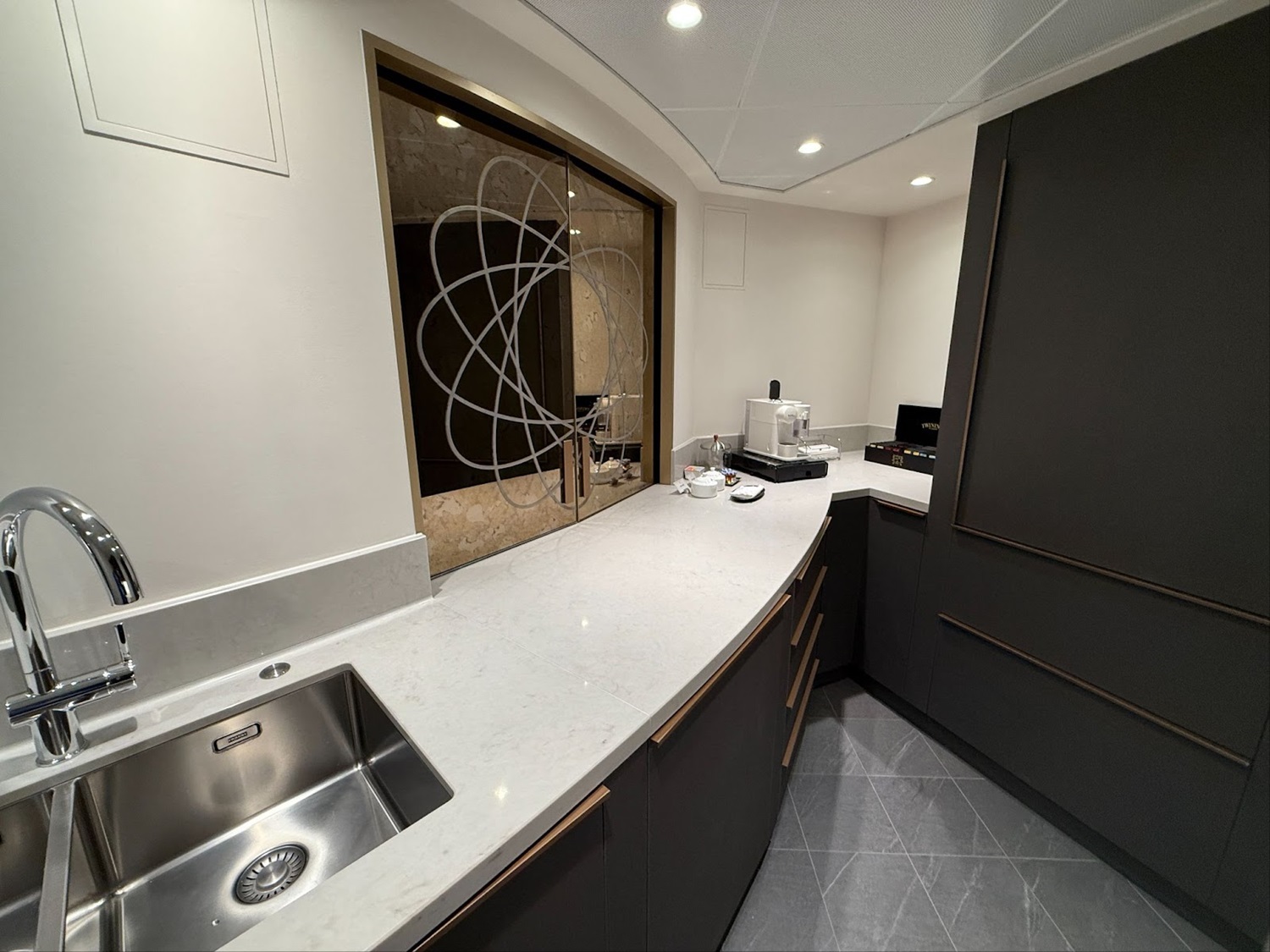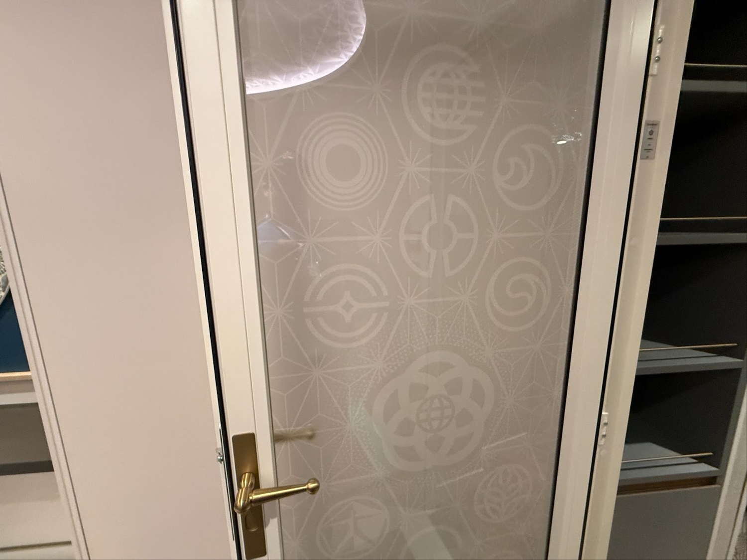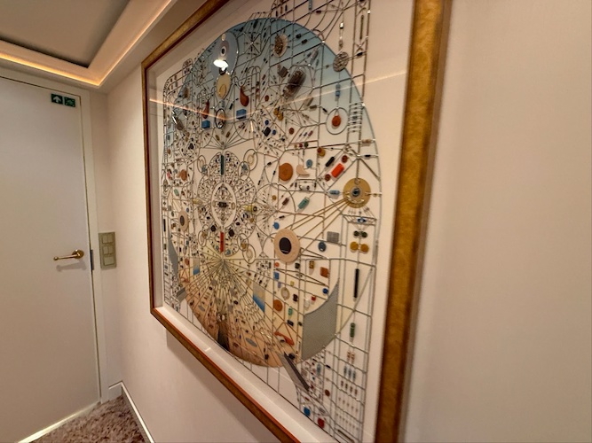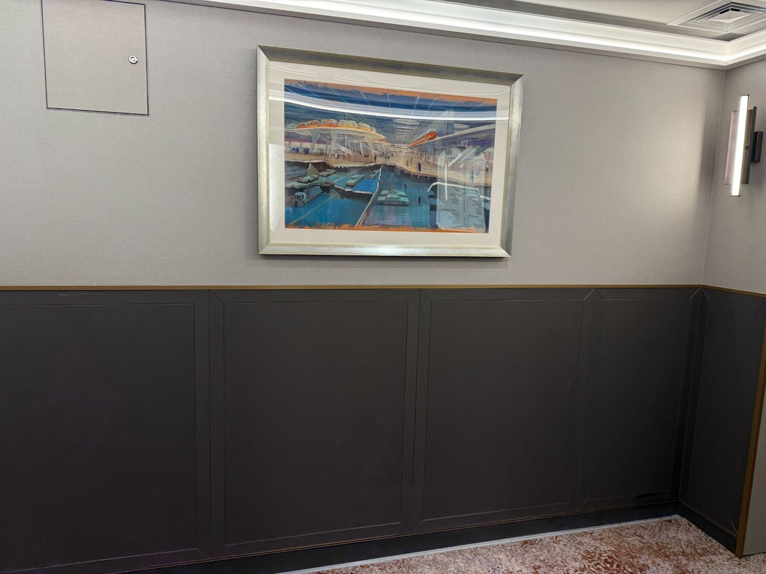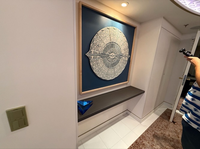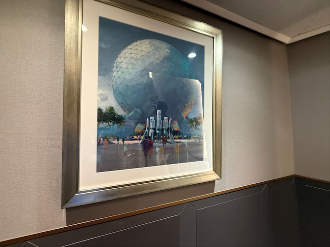 Guests booking a trip aboard the Disney Treasure can experience the spirit of EPCOT in the new luxurious Tomorrow Tower Suite. At nearly 2,000 square feet, the concierge level penthouse features its own private elevator, an expansive two story window with views of the ocean, 2 main bedrooms with walk-in closets, a library/bedroom, a children's room, and four and half bathrooms. Heading to the private elevator, guests will find classic EPCOT artwork and a Spaceship Earth inspired Room Number plaque.