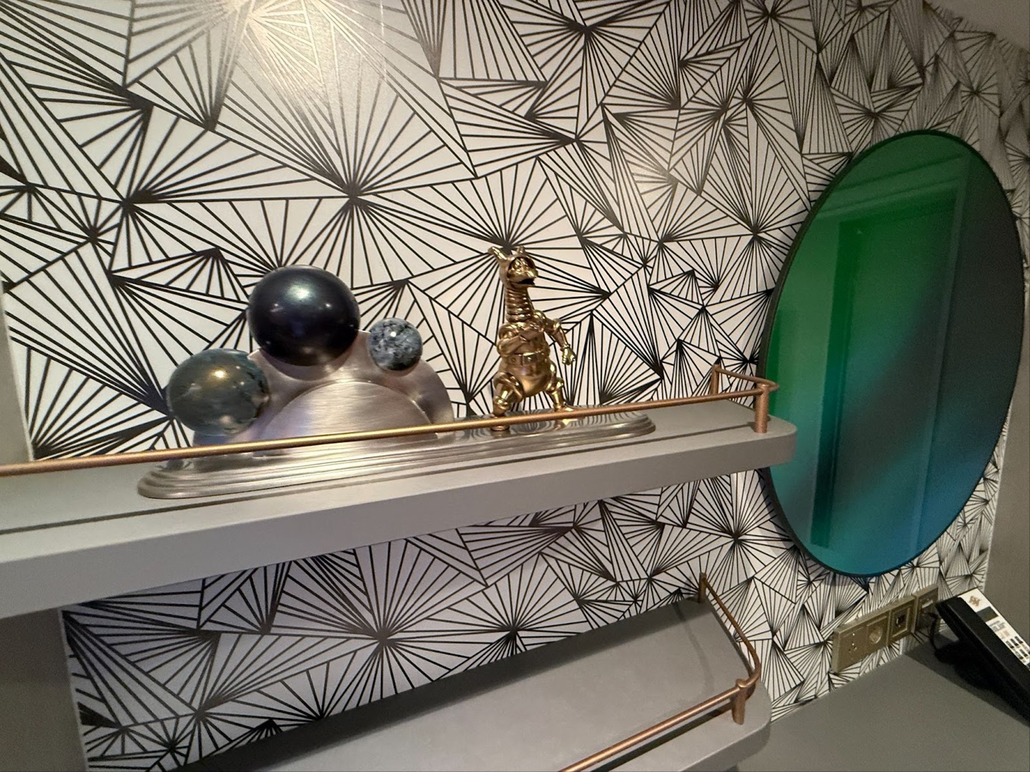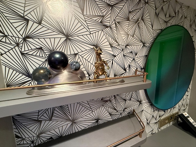 Upon heading up the elevator, guests are welcomed into the two-story suite with lighting and art inspired by the Walt Disney World theme park. Four statement pieces featuring the logos for World of Motion, The Living Seas, Spaceship Earth, and the Imagination Pavilion adorned the main entryway.