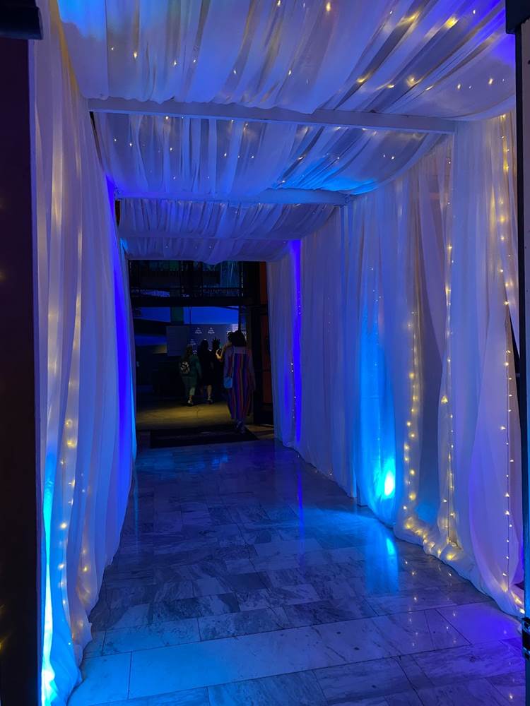 The Little Mermaid Enchanted Celebration began at 8:00 PM Friday evening at the Science Center’s event space, with fans lining up down the sidewalk for admission. Outside the entrance were some cool lighting effects and posters featuring characters from the movie.