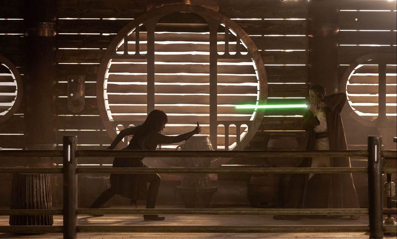 Episode 1 of The Acolyte, entitled “Lost / Found," begins with title card text which informs us that this story takes place 100 years before the rise of the Empire. It also rather erroneously claims that “the Jedi Order and the Galactic Republic have prospered for centuries without war," omitting the Nihil war from The High Republic that would have taken place fairly recently at this point in the Star Wars timeline. Then we cut to the planet Ueda (newly introduced here), where a lone assassin approaches a settlement and asks for the location of its Jedi. This assassin is Mae (played by Amandla Stenberg from The Hunger Games) and her target is Jedi Master Indara (Carrie-Anne Moss from The Matrix franchise and Memento), who she challenges to attack her without provocation. “Jedi do not attack the unarmed," replies Indara, but Mae begins to wreak havoc in the restaurant where she found her quarry, to the point where the Jedi Master is forced to intervene. A vigorous fight breaks out, with Mae first attempting to kill Indara without any weapons, but then resorting to the use of small metallic blades vs. the Jedi’s lightsaber. The battle comes to an end when Mae distracts Indara by threatening the life of the alien bartender, then impaling her with one of the deadly blades.