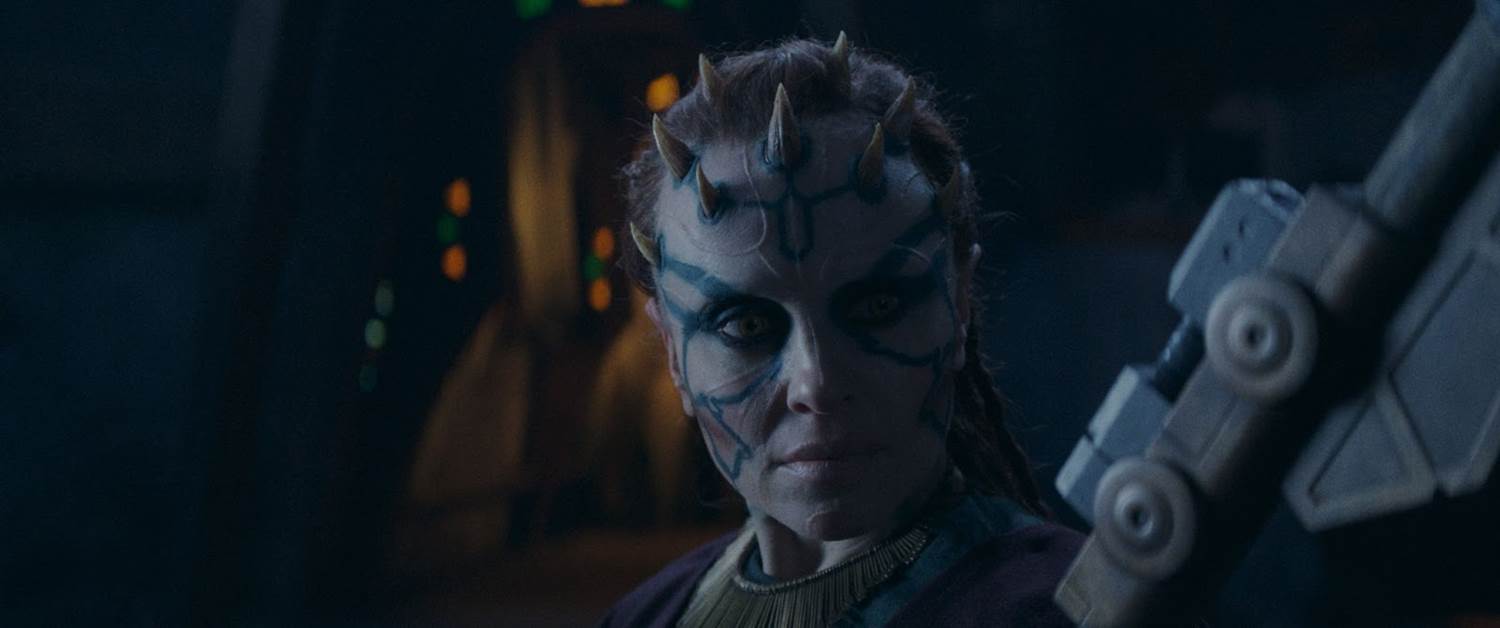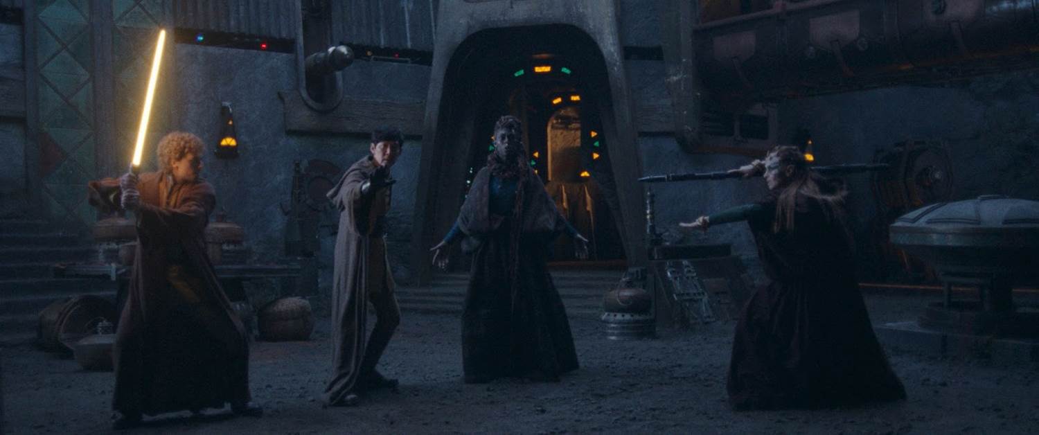 Sol goes after him, and when he and Torbin find that the elevator into the base has been deactivated, they opt to scale the wall instead. A conflict breaks out between these two Jedi and the witches– most notably Mother Koril (Margarita Levieva), who steadfastly refuses to let her children leave the planet with these strangers. Sol assures the witches that the Jedi’s intentions are noble, but also demands to know how the twins were created. When Mae, who has been proven to be the one who actually started the fire– though somewhat accidentally– enters begging for help, the tense moment erupts into chaos, with Aniseya taking smoke-like form and Sol impaling her with his lightsaber defensively. She dies saying that she would have let Osha go with the Jedi since that was Osha’s wish. Then the real fight erupts between Sol, Torbin, Koril, and the other witches, until the latter reveal their secret weapon: a corrupted Kelnacca, who had jumped into the fortress from the Jedi ship above, being piloted by Indara. Kelnacca lashes out at his friends with his saber, under the black-eyed control of these mysterious Force users.