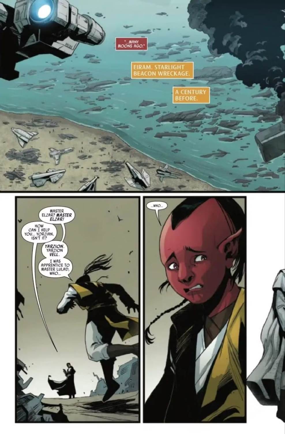 With the recent news that Lucasfilm’s live-action series Star Wars: The Acolyte has not been picked up for a second season, it seems likely that the venue through which this story will continue is the publishing arm of the George Lucas-created company. And indeed, though this comic was already announced before the aforementioned cancellation took place, we are already getting one of The Acolyte’s characters’ backstory fleshed out– namely Kelnacca, the Wookie Jedi Master. Back when the series was just being teased, I thought for sure that Kelnacca would turn out to be an assumed name for Burryaga, who is another Wookiee Jedi character in the period of the High Republic, but both the show and this comic have confirmed that not to be the case. The opening scene here depicts another elderly Jedi Master named Yarzion Vell on his deathbed, with his young Padawan wondering who is going to pick up her training after he’s gone. This triggers a flashback to a similar situation in which Yarzion lost his master to the Starlight Beacon disaster, as depicted at the end of Star Wars: The High Republic Phase I.