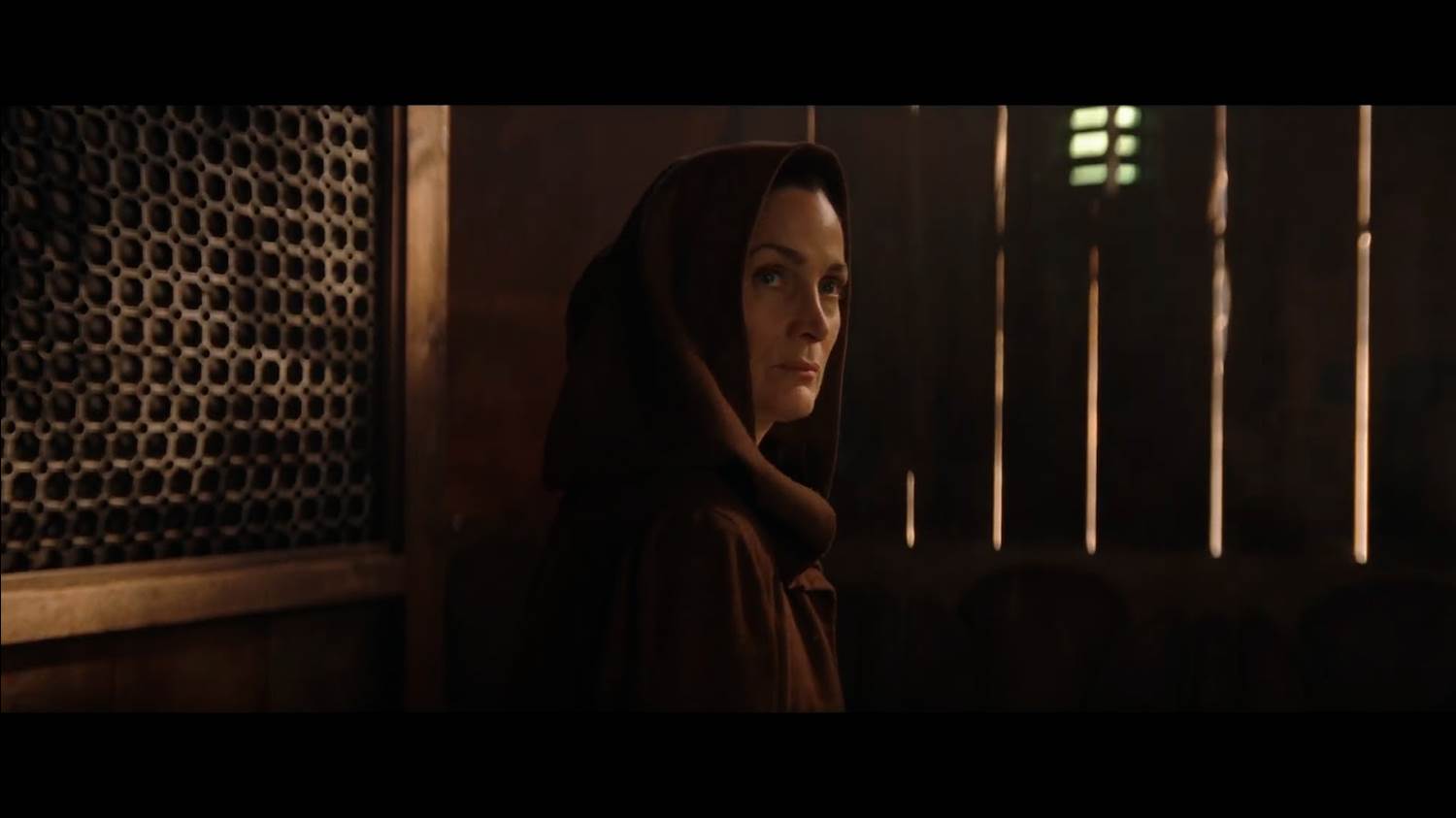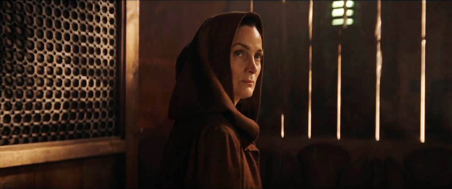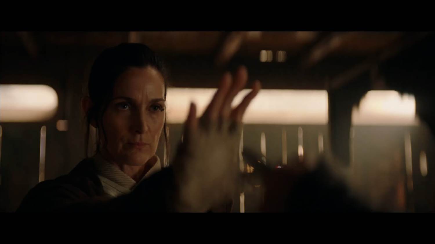 Shot #14: At a booth in the restaurant, we are introduced to the character of Jedi Master Indara, played by actress Carrie-Anne Moss (The Matrix). She turns her head to look at the approaching figure.