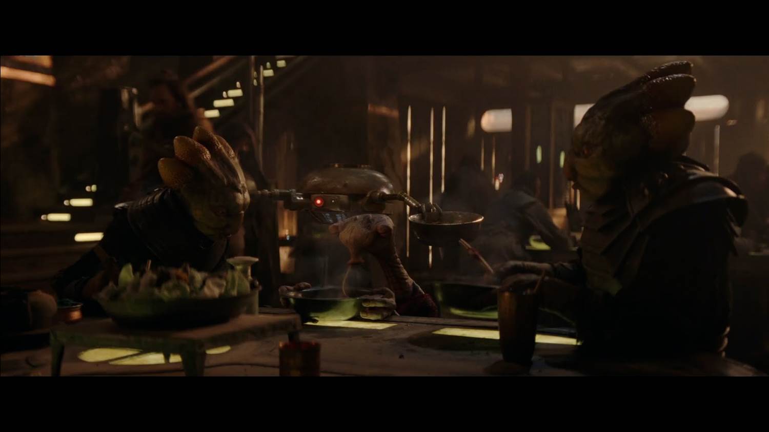 Shot #10: We see the patrons of this bar or restaurant. A server droid delivers bowls to a variety of aliens, none of which I recognize as identifiable species.