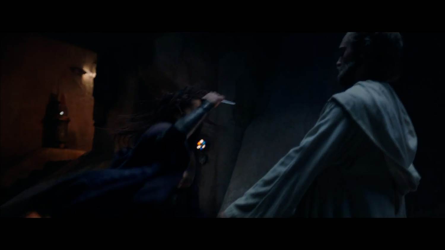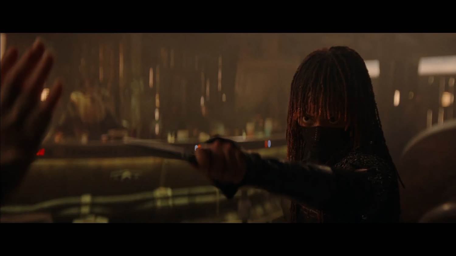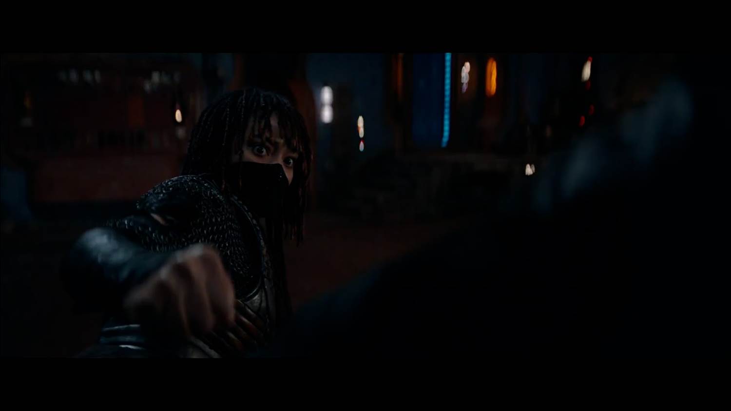 Shot #15: The action begins, with Indara battling the cloaked figure, who has been revealed to be Mae (Amandla Stenberg from The Hunger Games), in hand-to-hand combat. The fight choreography here is reminiscent of what we saw Moss capable of executing in The Matrix franchise. Mae appears to wield two small blades.