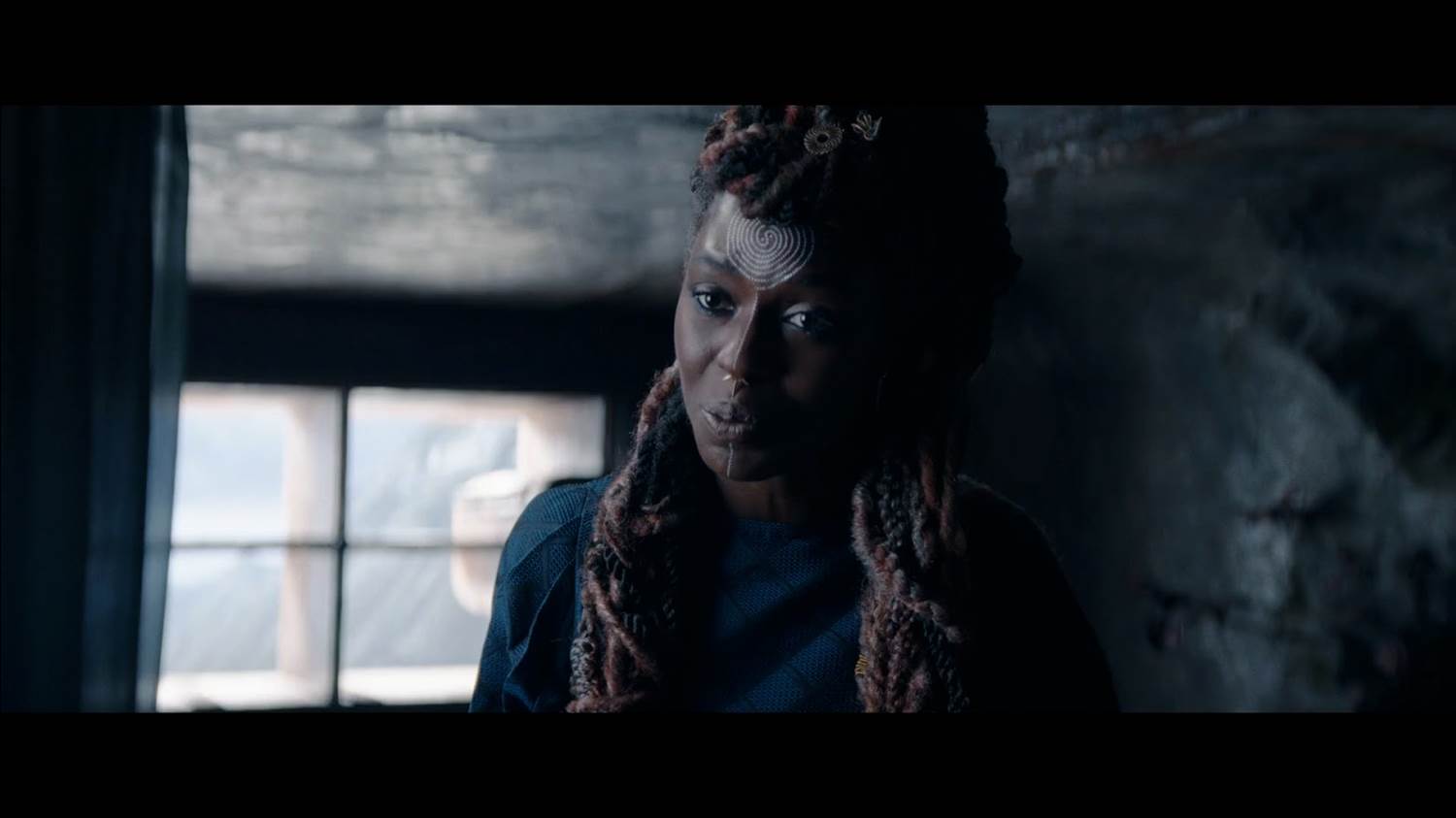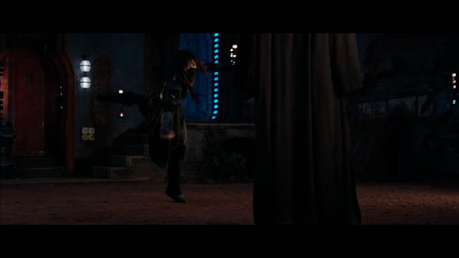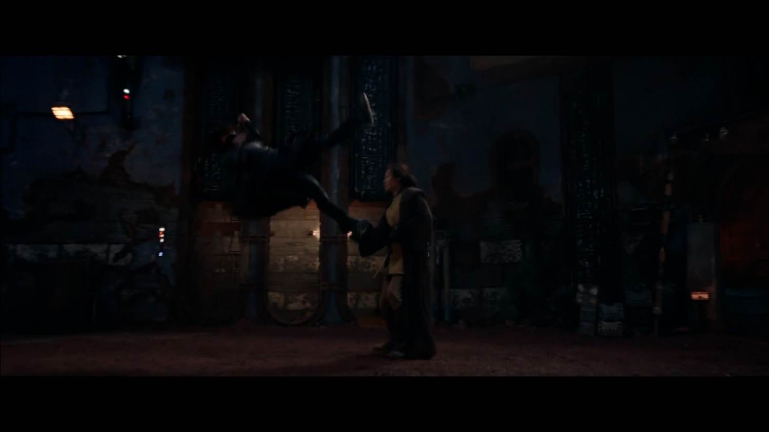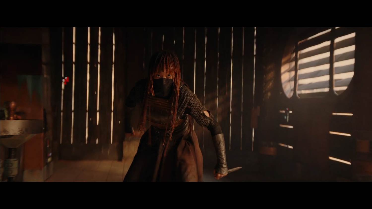 Shot #15: The action begins, with Indara battling the cloaked figure, who has been revealed to be Mae (Amandla Stenberg from The Hunger Games), in hand-to-hand combat. The fight choreography here is reminiscent of what we saw Moss capable of executing in The Matrix franchise. Mae appears to wield two small blades.