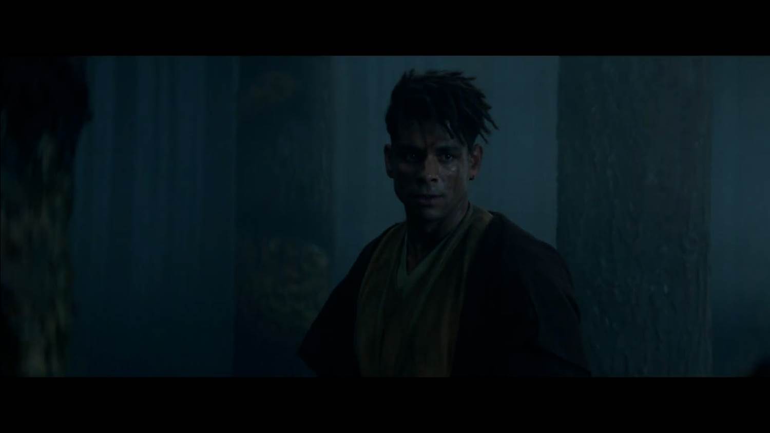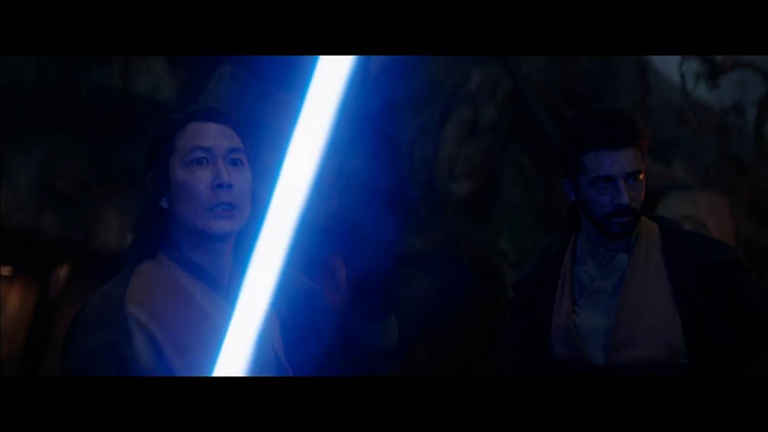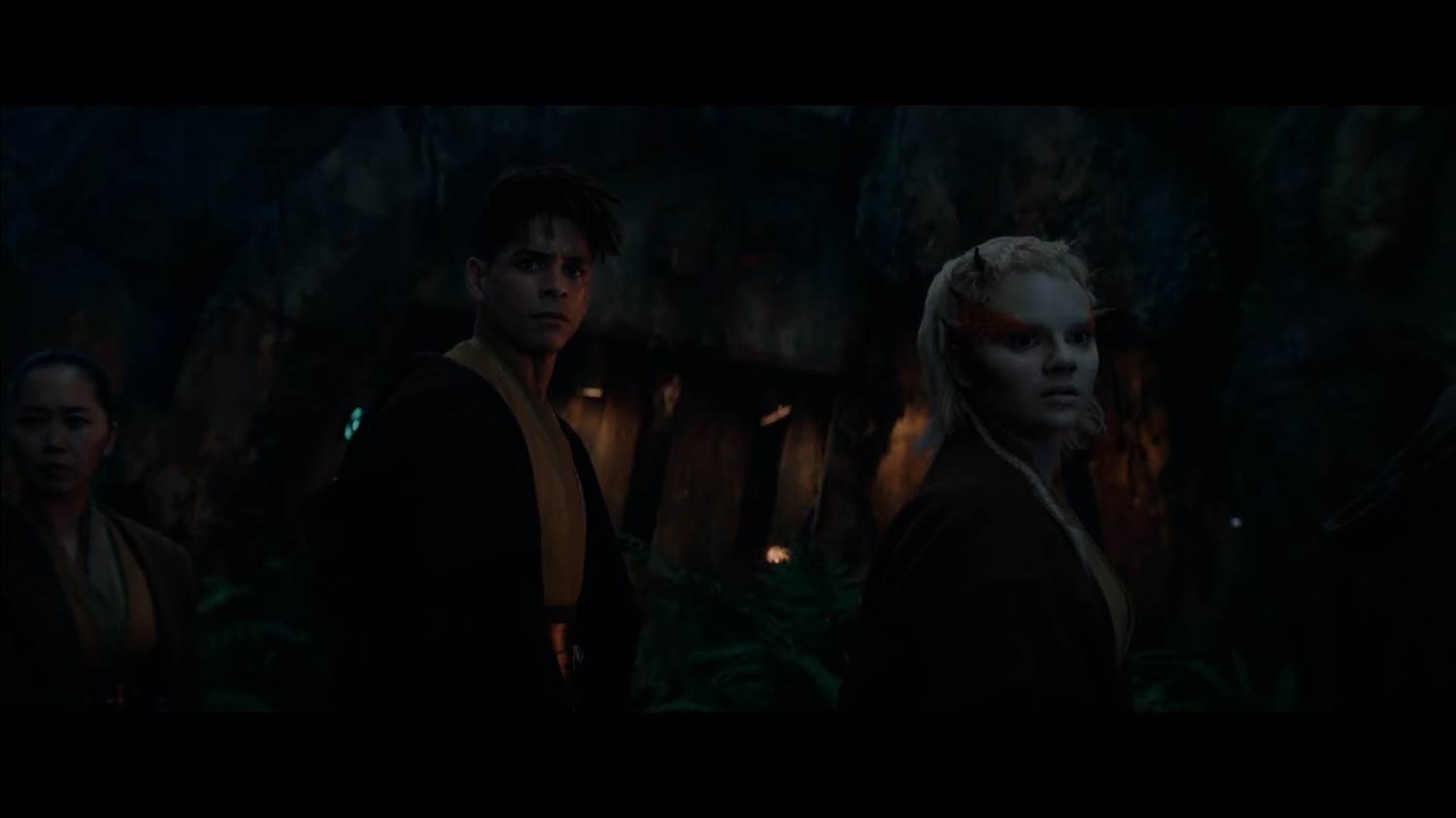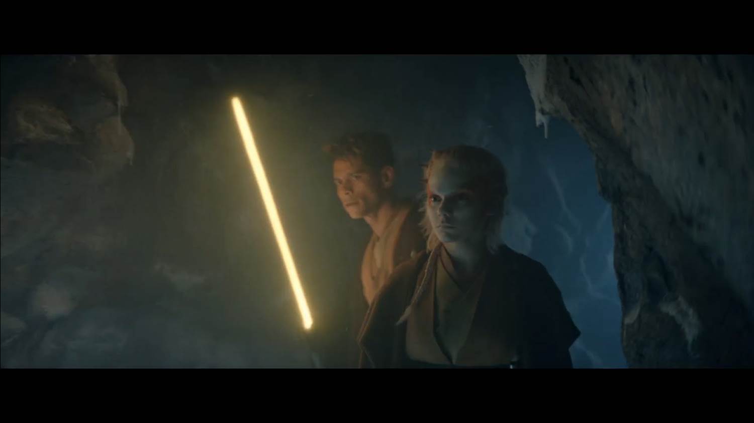Shot #20: Two Jedi, the human Yord Fandar (Charlie Barnett from Men In Black 3) and the Theelin Jecki Lon (Logan’s Dafne Keen) venture into a cave as Yord ignites his yellow-bladed lightsaber.