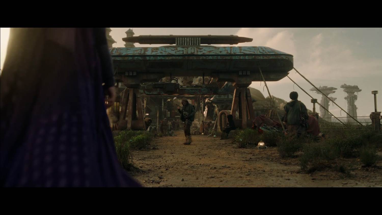 Shot #5: We cut to a different, more verdant planet as a purple-cloaked figure approaches an arch. This structure resembles Star Wars architecture we’ve seen before, both in Ralph McQuarrie concept art and in movies like The Force Awakens.