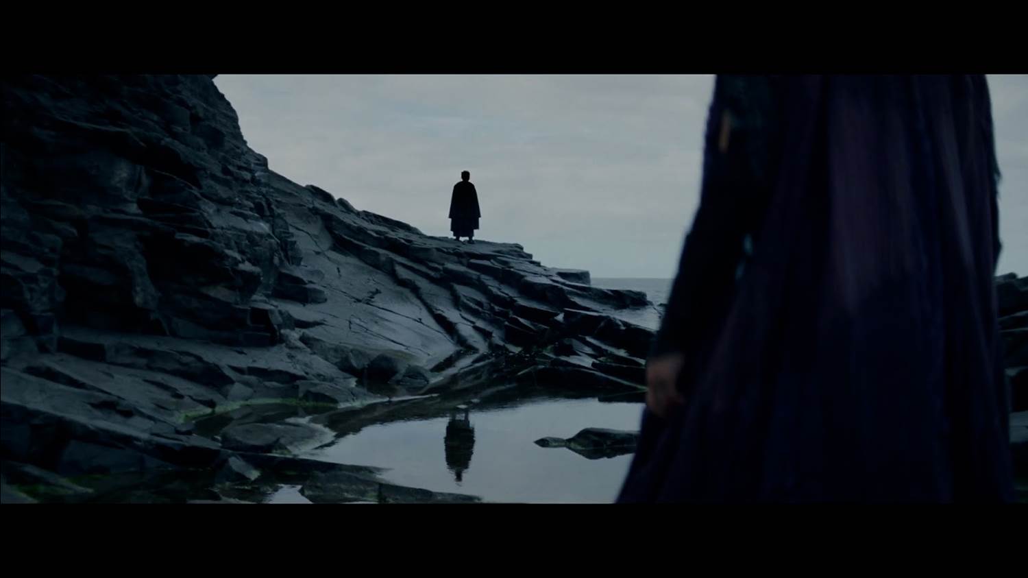 Shot #46: This looks like it might be Mae in the foreground now, as she steps into frame while a figure stands in silhouette in the background, their image reflected in the water below. Now this planet is giving me major Ahch-To vibes. I like this shot a lot.