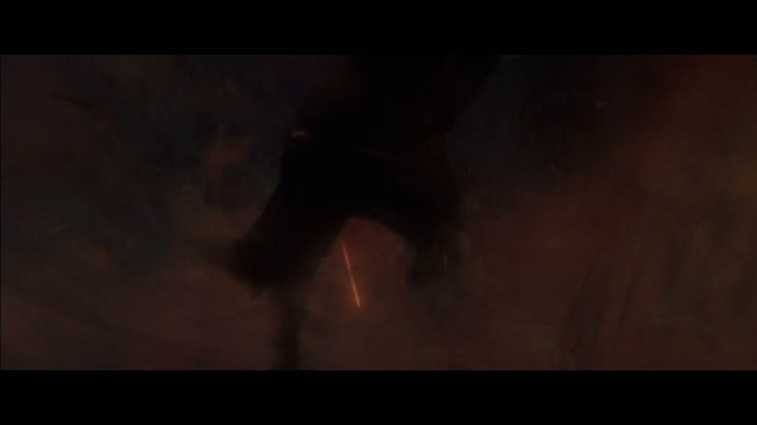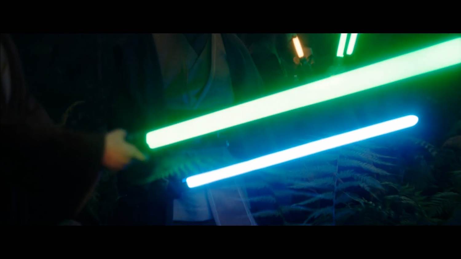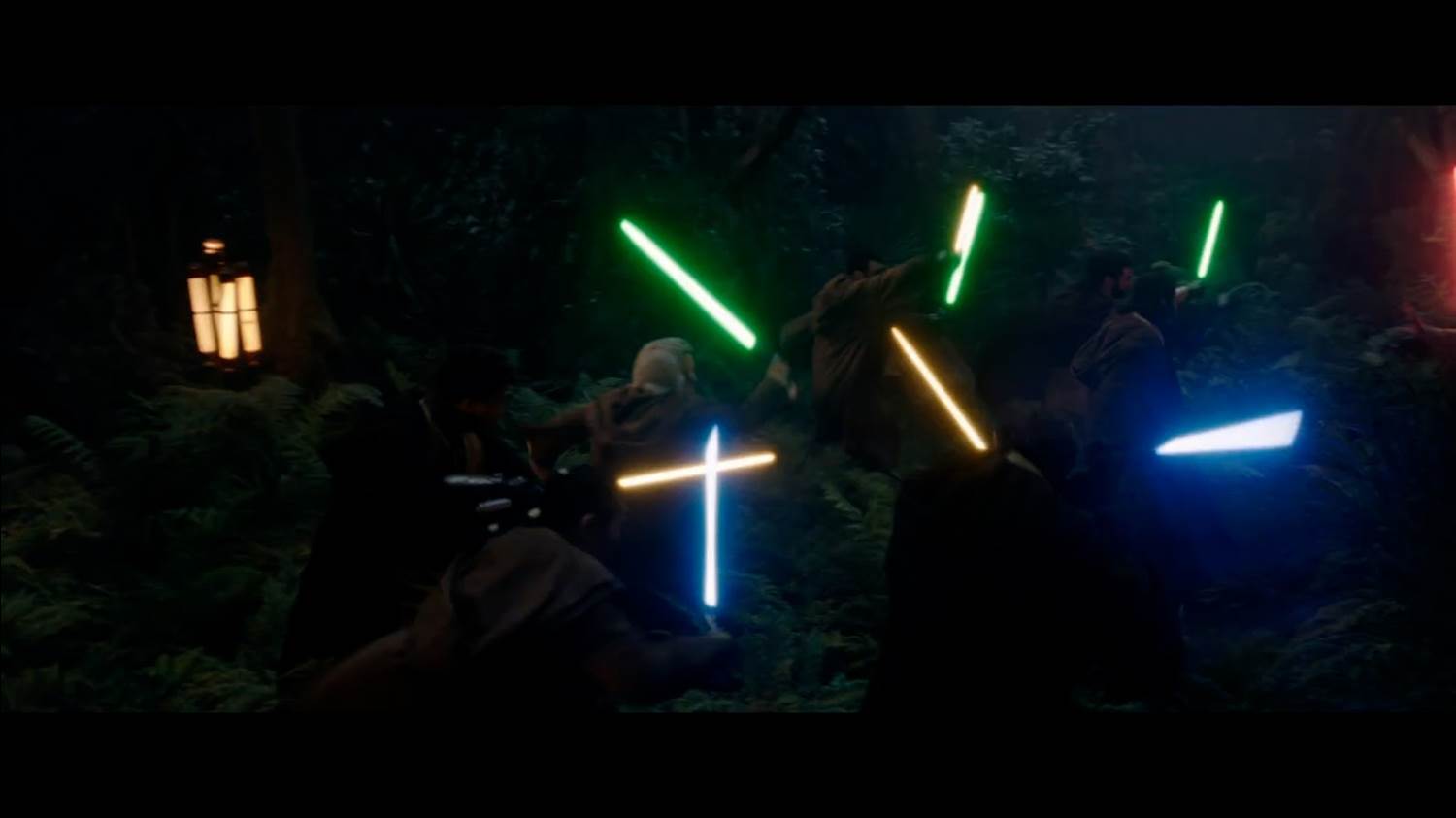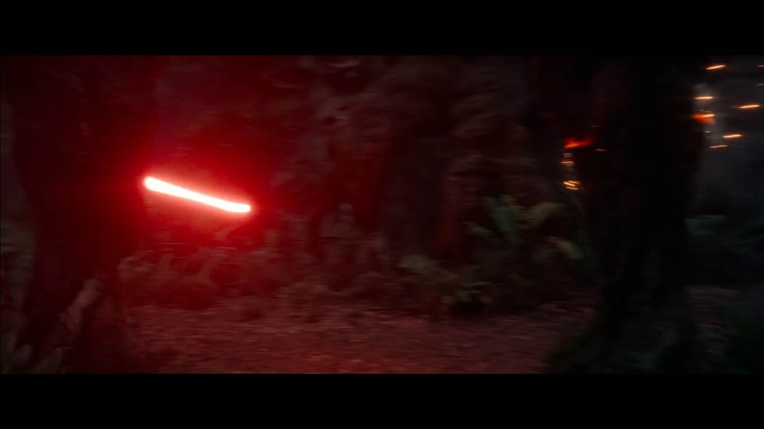 Shot #48: A red-bladed lightsaber cuts through the darkness, slicing through trees as it spins. This is significant because the Sith (whose sabers tend to be red due to their corrupted Kyber crystals) are supposed to be extinct during this period of the Star Wars timeline, or at least so the Jedi Order believes.