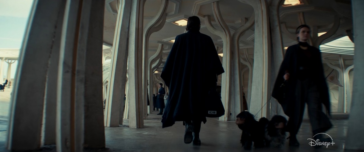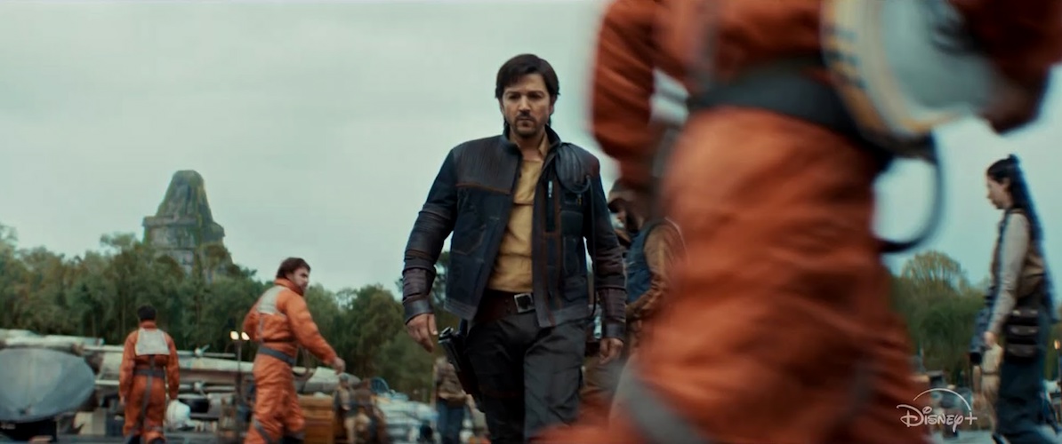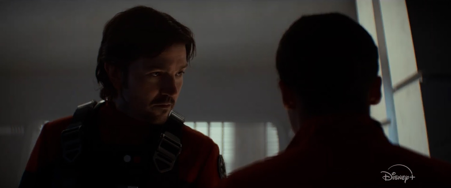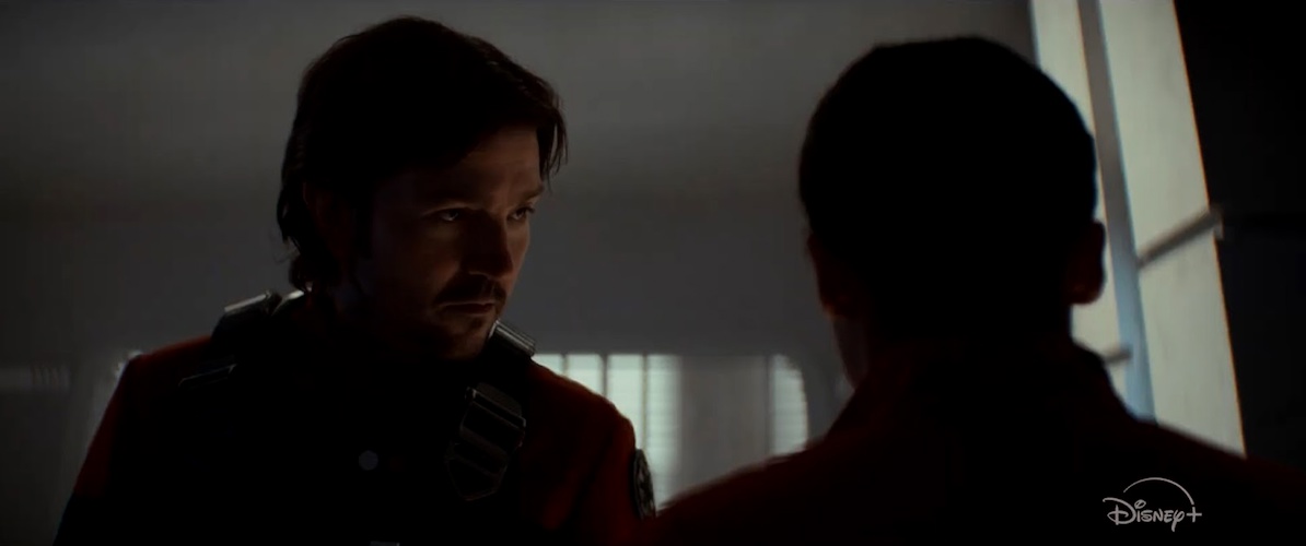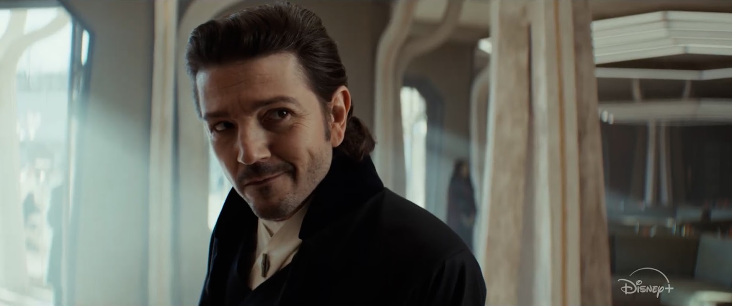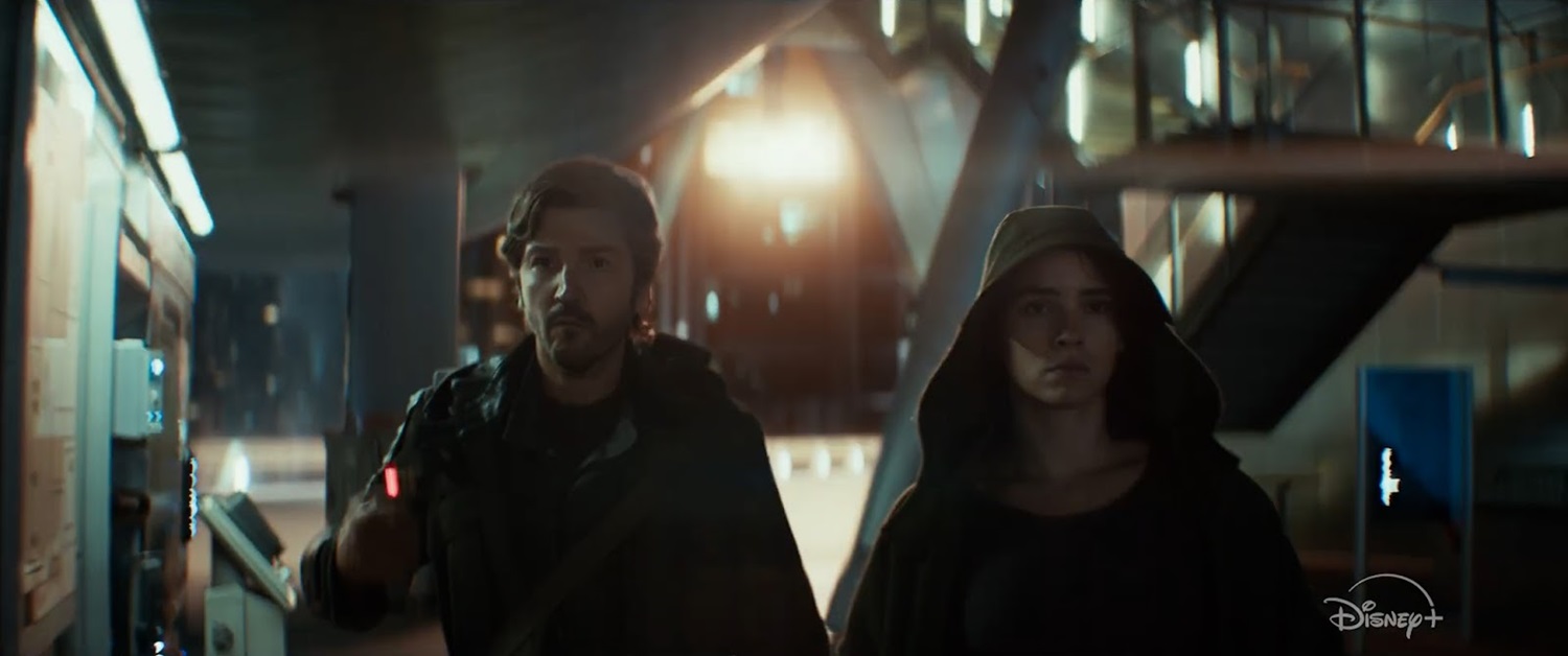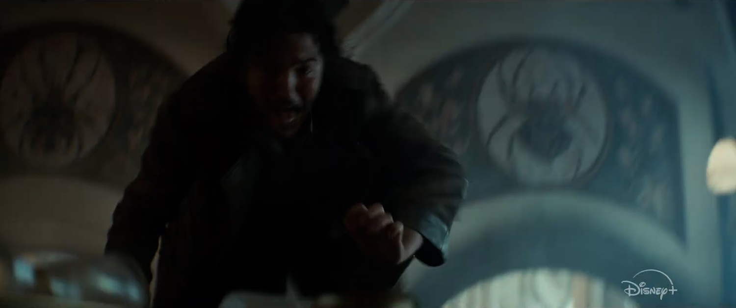Shot #1 - The camera follows from a low angle behind Cassian Andor (played once again– and probably for the final time– by Diego Luna) is dressed in a cape as he walks through a breezeway on what looks to be an upper-class planet, though we don’t know which one. I’m going to take a wild stab at it and say Chandrila, just because of some of the stuff we see later on in the trailer. Cassian is carrying a black case with markings on it. A woman strolls past him walking some dog-like creatures, and other people mill about in the background.