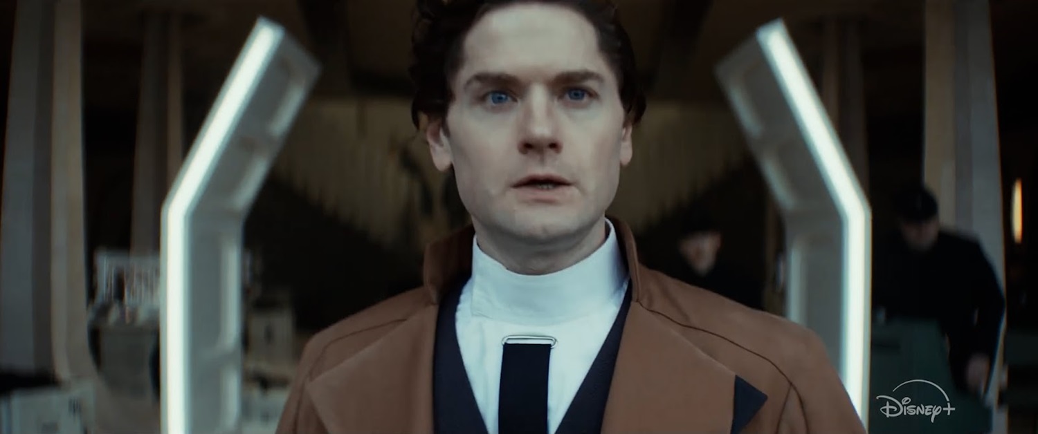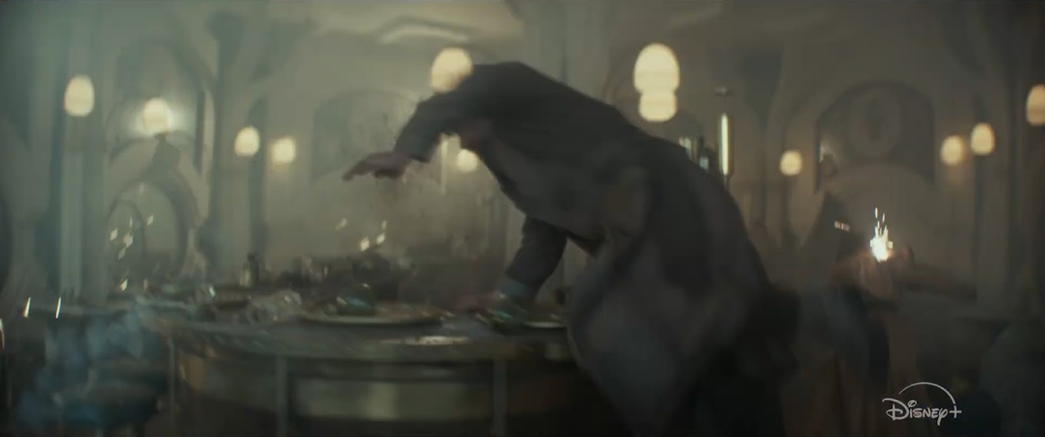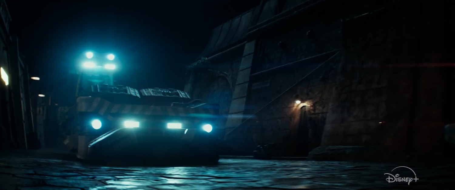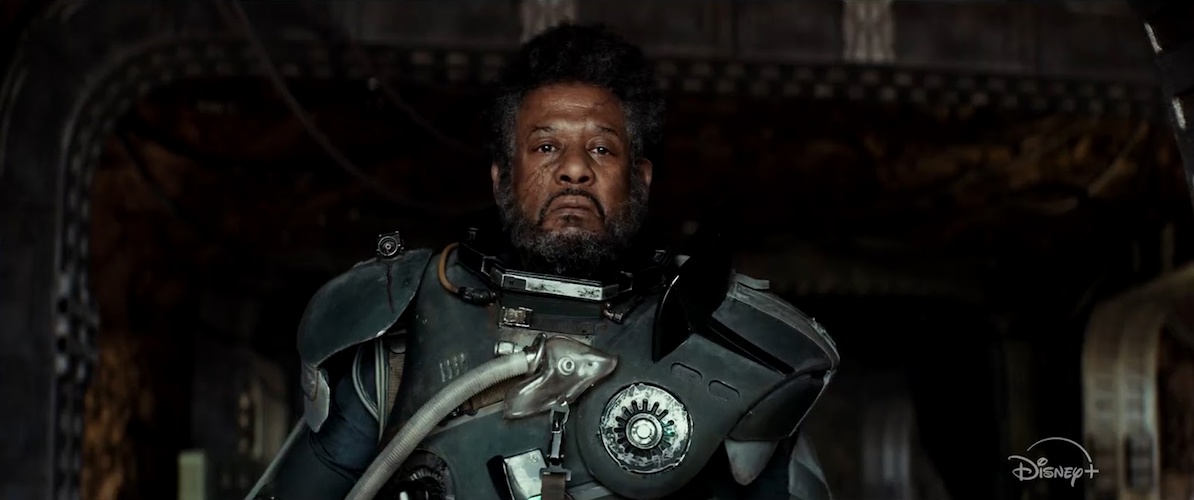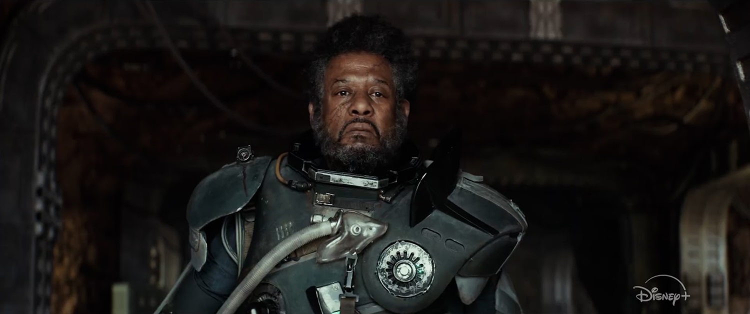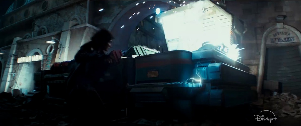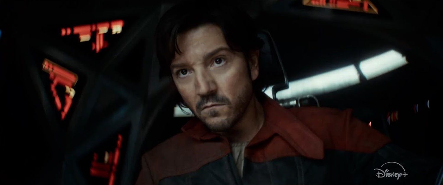 Shot #1 - The camera follows from a low angle behind Cassian Andor (played once again– and probably for the final time– by Diego Luna) is dressed in a cape as he walks through a breezeway on what looks to be an upper-class planet, though we don’t know which one. I’m going to take a wild stab at it and say Chandrila, just because of some of the stuff we see later on in the trailer. Cassian is carrying a black case with markings on it. A woman strolls past him walking some dog-like creatures, and other people mill about in the background.