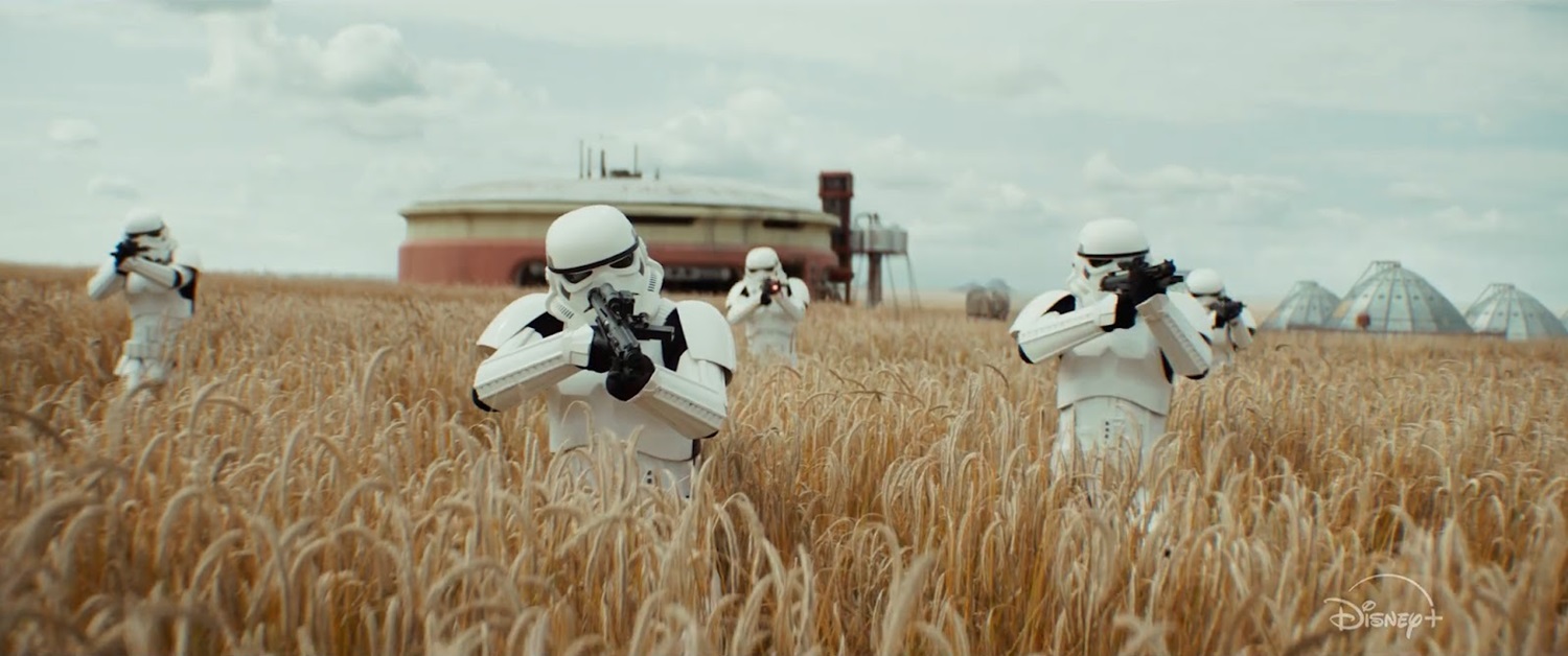 Shot #10 - Five stormtroopers fire after Cassian (?) as he flees them. There’s another circular structure and some yurt-like buildings behind them.