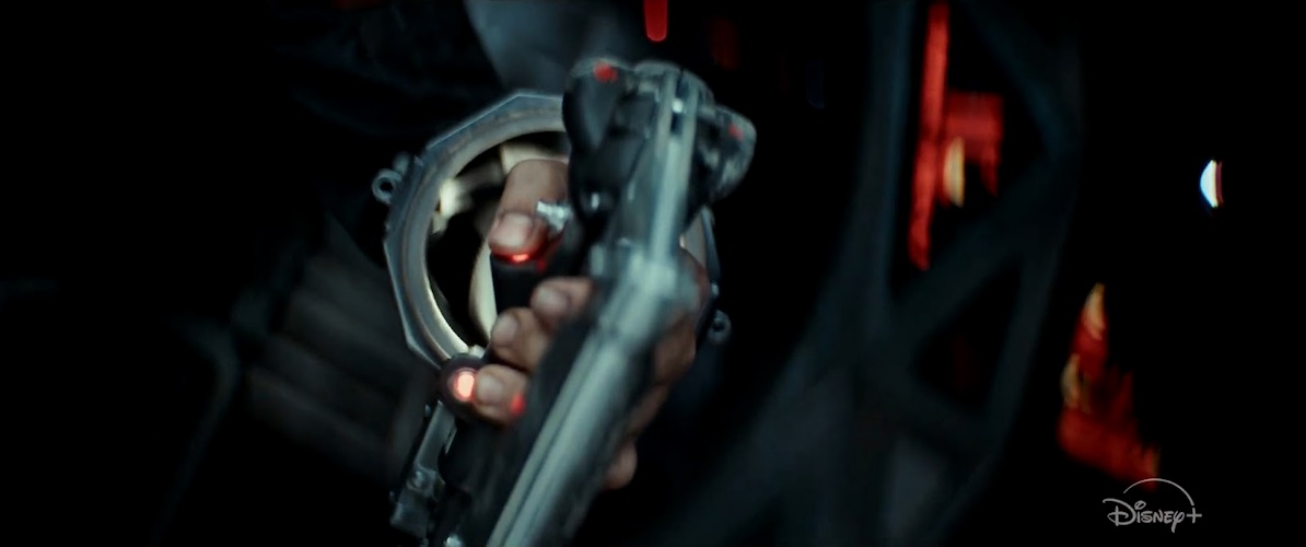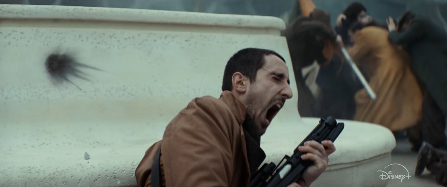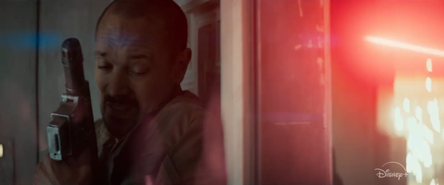 Shot #39: I think this is Ruescott Melshi (Duncan Pow), who escaped from the prison on Narkina-5 with Cassian in season 1 and later dies on Scarif in Rogue One. Here he’s using a doorjamb as cover as he wields a blaster. Explosions and laser blasts are going off to the right behind the door.