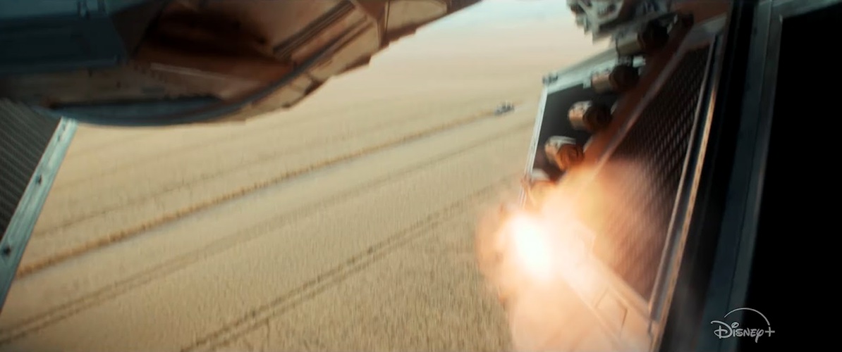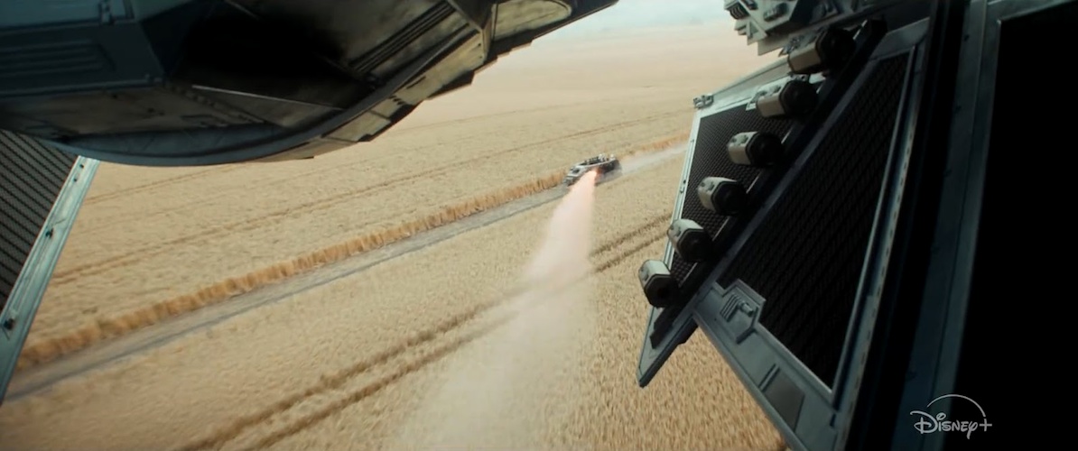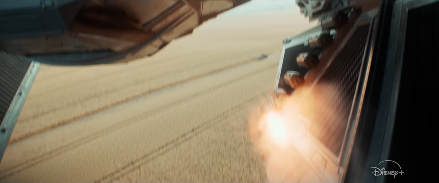 Shot #12A - A torpedo launches from the TIE Avenger (?) toward a ground vehicle traveling down a path through the same field of grain. This leads me to believe it might not actually be Cassian running in shot #9, but it’s hard to say.