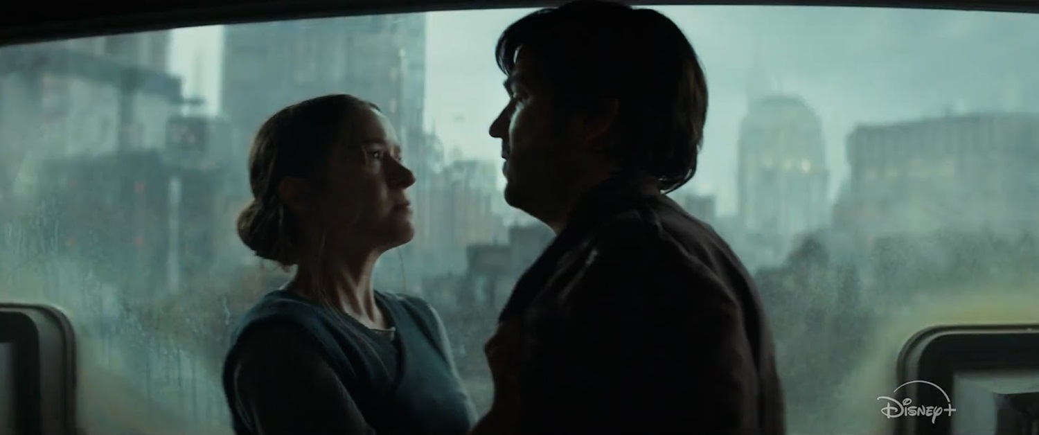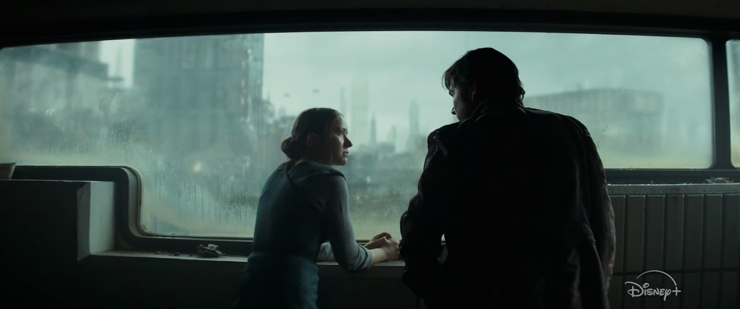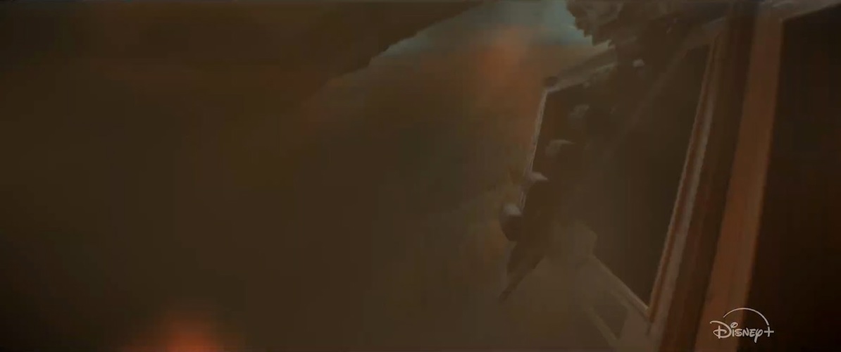 Shot #21: Another actress I am struggling to recognize, but it might be Elizabeth Dulau as Kleya Marki, grabs Cassian next to a window. It’s raining outside, and we see a cityscape in the background. Could be Coruscant. There’s something odd on the windowsill, almost like little origami starships. I almost wonder if this is Eedy Karn’s apartment, though I don’t think we ever saw a window that big in her living room.