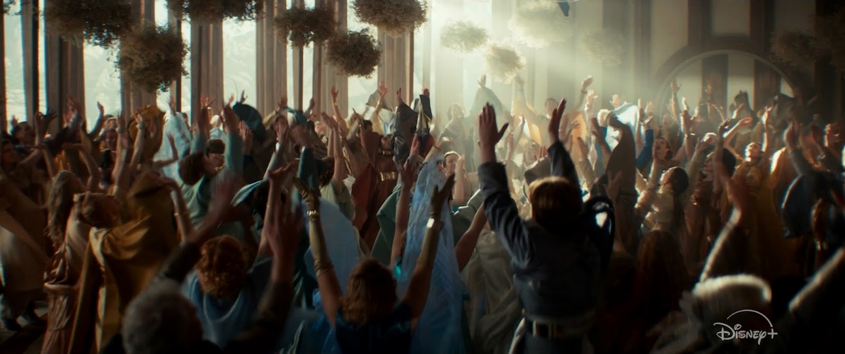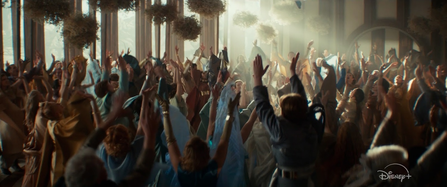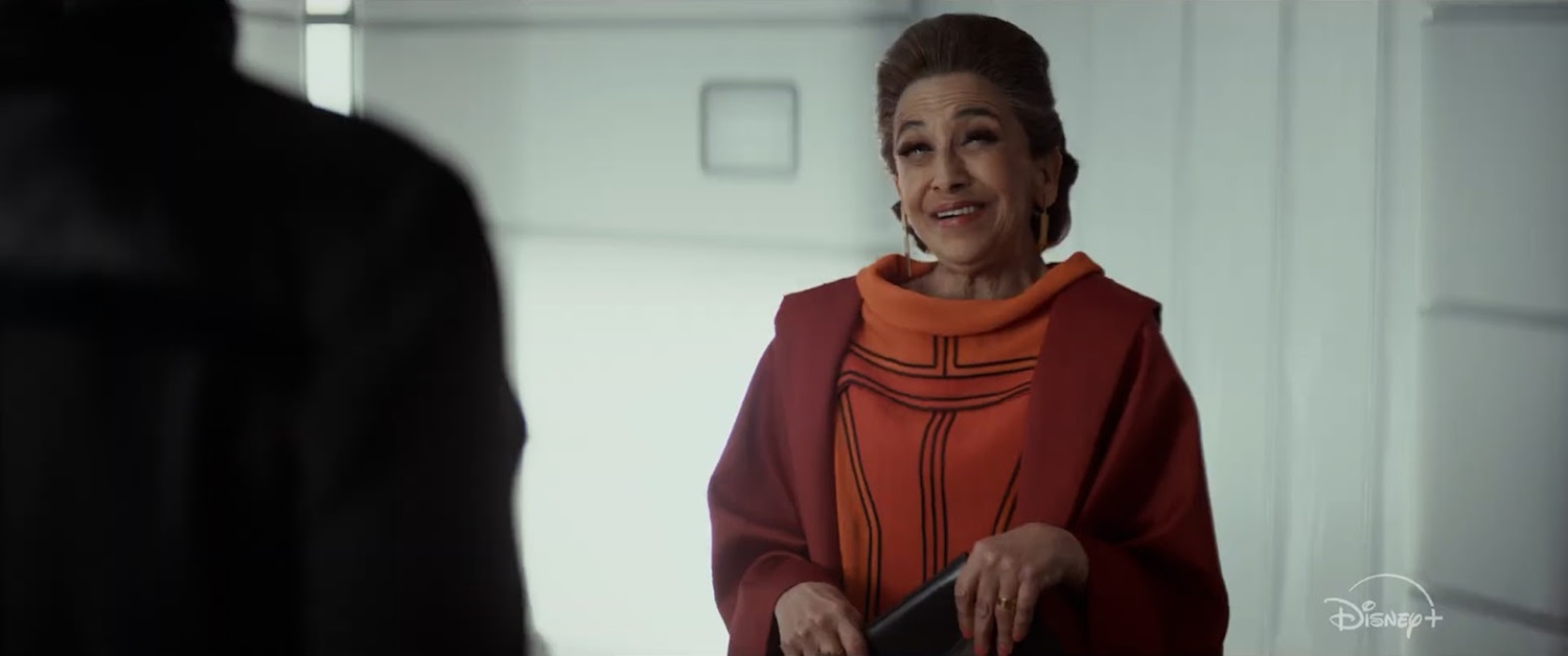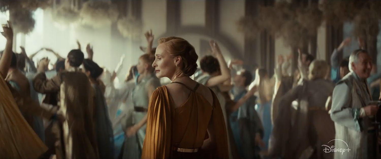 Shot #14 - Mon Mothma (Genevieve O’Reilly) is at a party on what I believe to be her home planet of Chandrila. She turns around to face the camera as revelers dance behind her. There’s moss hanging from the ceiling.