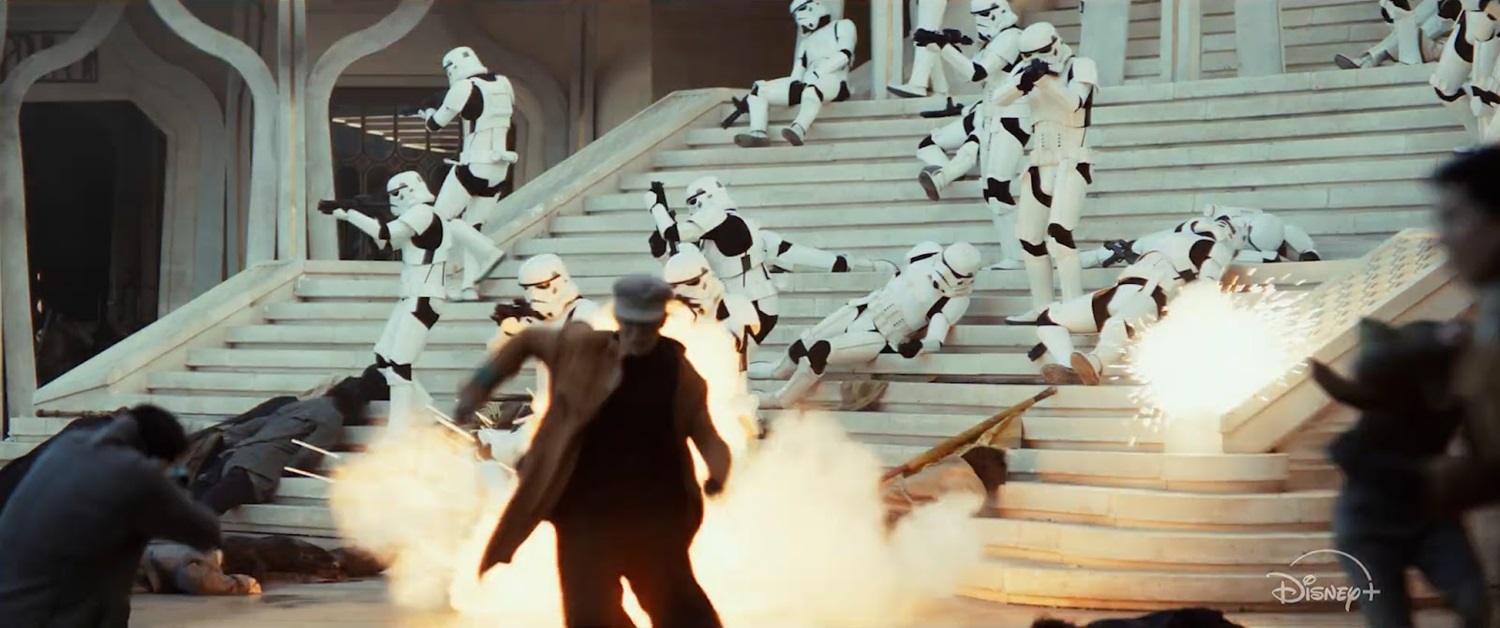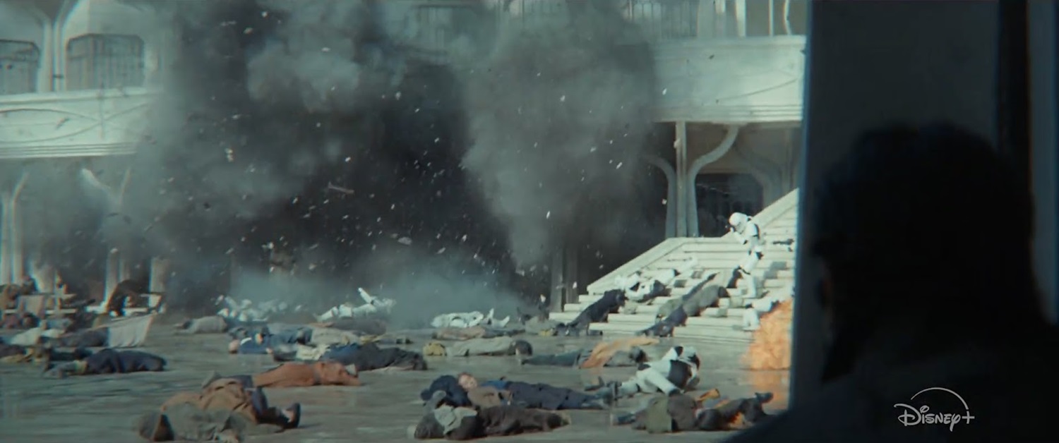 Shot #20B: Cassian lowers the rifle when an explosion goes off in the background, sending stormtroopers flying. Now we can see the troopers are on the same stairs from shot #2.