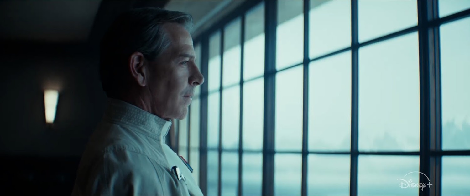 Shot #17 - Director Orson Krennic (Ben Mendelsohn) looks out a set of windows at a misty landscape and grins. He’s wearing his trademark white Imperial Security Bureau uniform.