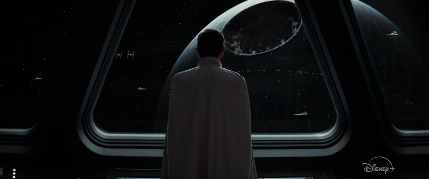 Shot #18 - The editor wants to trick us into thinking this is the following shot, but it’s in an entirely different location. We’re behind Krennic now on the bridge of an Imperial Star Destroyer as he looks out at the nearly completed Death Star. The battle station’s superlaser is still under construction as we saw in season 1’s post-credits sequence.