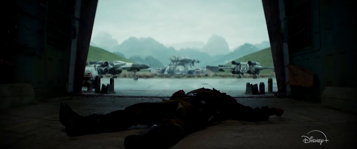 Shot #19A - There’s a dead body in a flight suit on the ground at Saw Gerrera’s insurgent base on another misty planet. We’re looking out through the door into the base’s own airfield.