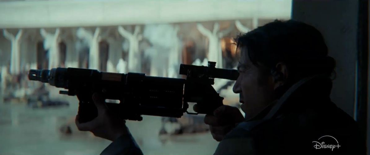 Shot #20A: Cassian lines up a shot through the scope of a blaster rifle. We’re back on the same planet from the first couple of shots in the trailer. There are bodies on the ground behind him.