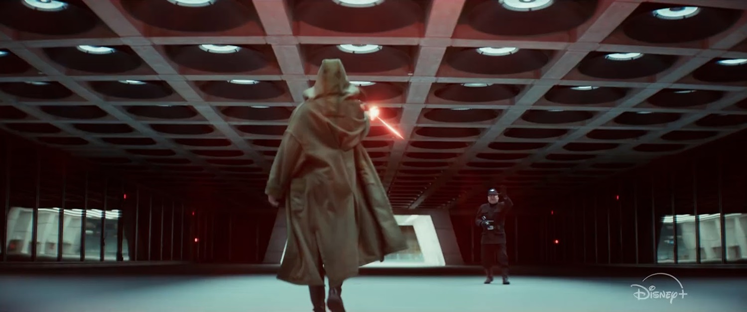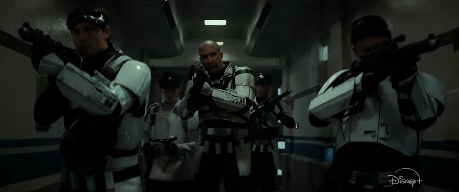 Shot #6 - Although maybe I’ll take that guess back, because now Cassian’s got his hood up and we see that it’s a longer duster he’s wearing. He fires his blaster at an Imperial officer in a large, warehouse-type room with lots of overhead lights. The officer takes a hit in his right shoulder and starts to go down before we cut away.