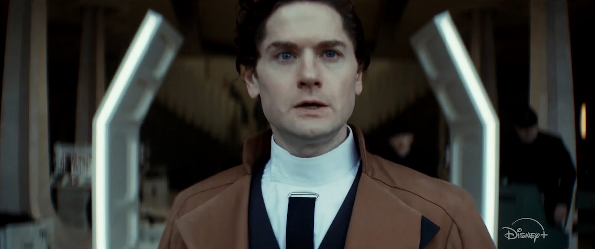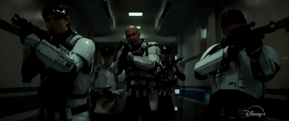 Shot #37: Here’s Syril Karn (Kyle Soller) running through a security checkpoint toward the camera and looking concerned. There are several black-uniformed imperial officers behind him.