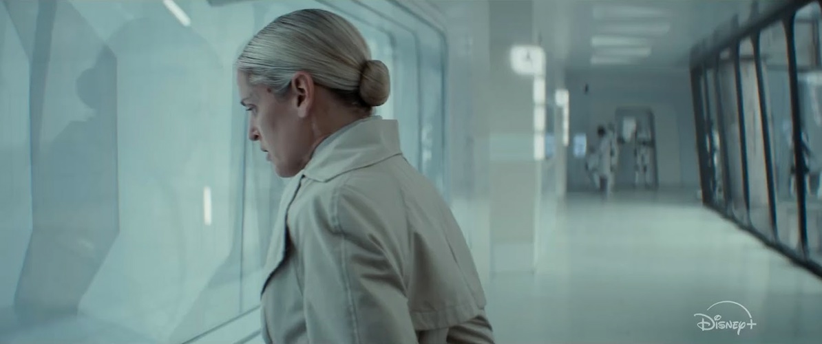 Shot #25: Dedra Meero (Denise Gough) peers out through a window in what is presumably the ISB offices. We can see more troopers in the background. Dedra leans back and closes her eyes in frustration.