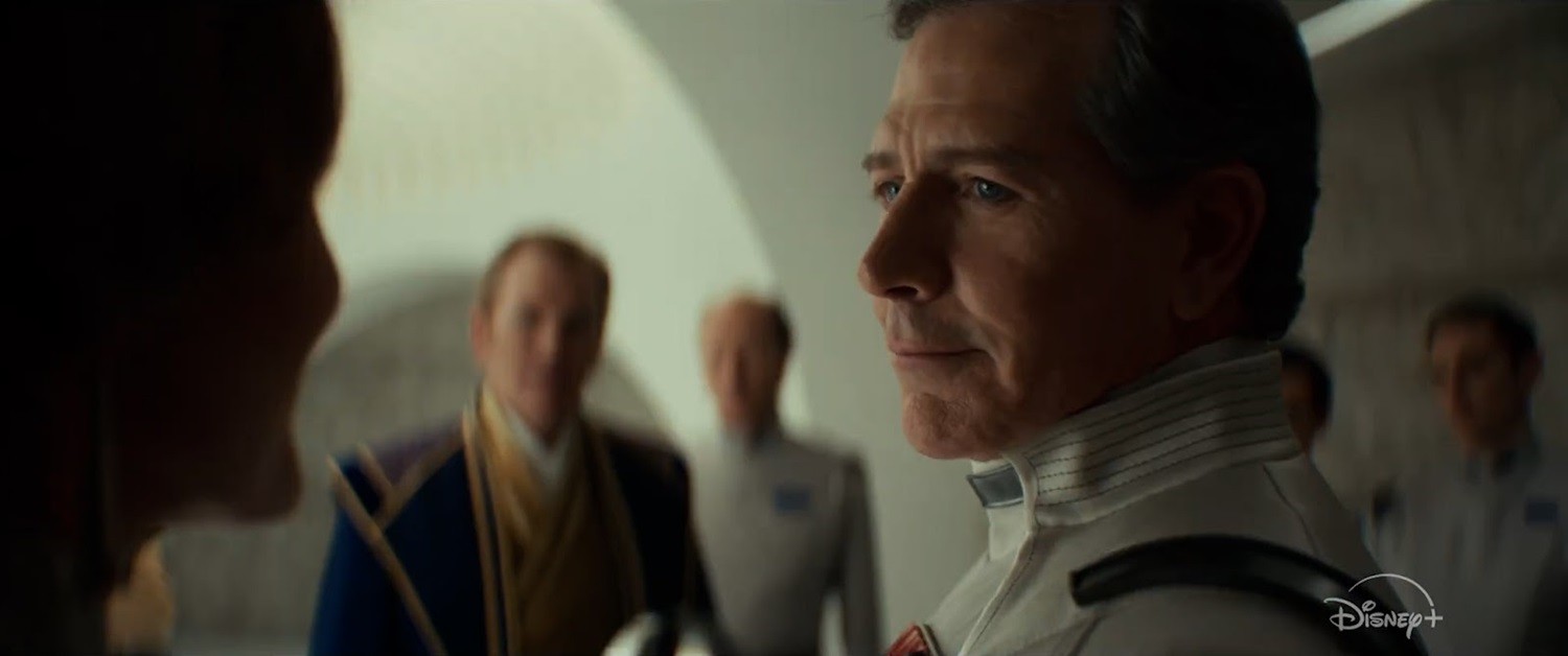 Shot #26: In close-up, Krennic raises his eyebrows and smiles at someone (could it be Mon Mothma?) who is only visible in silhouette and slightly off-camera. I believe the out-of-focus character on the left side of the background to be Davo Sculdun (Richard Dillane), the Chandrilan oligarch who agreed to help Mon launder her money in season 1. There are also ISB officers visible behind Krennic.