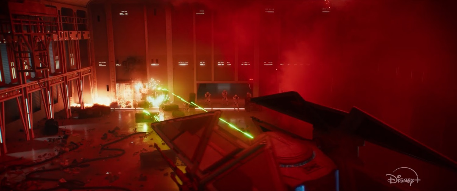 Shot #27: The TIE Avenger (?) is back, and now it’s blasting away at a row of stormtroopers in a hangar bay.