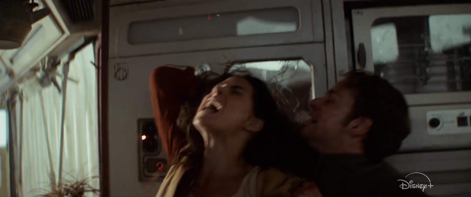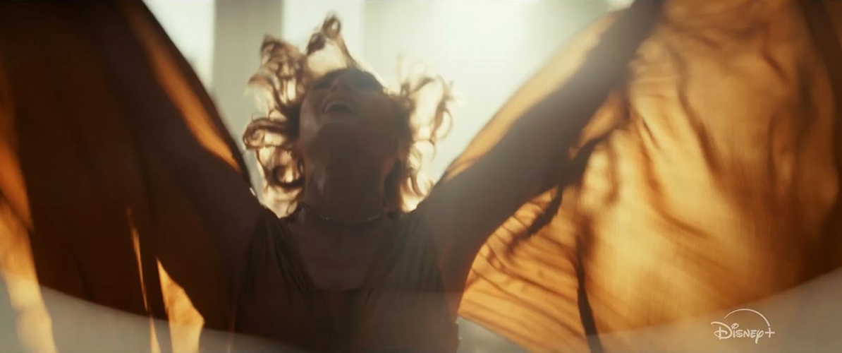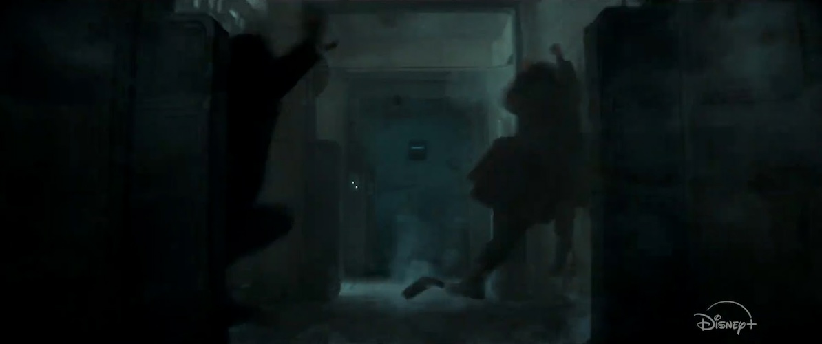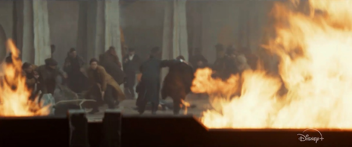Shot #16 - A hooded woman walks toward the camera and is joined by Cassian, who presses a button on a control in his hand, triggering an explosion behind them, lighting up a facility with multiple levels and staircases. The actress didn’t look familiar to me, but I have been told it’s Adria Arjona as Bix Caleen. I guess she looks different with her hair covered up.