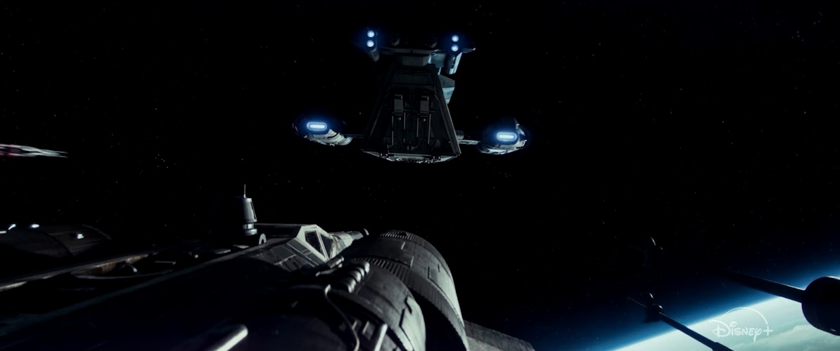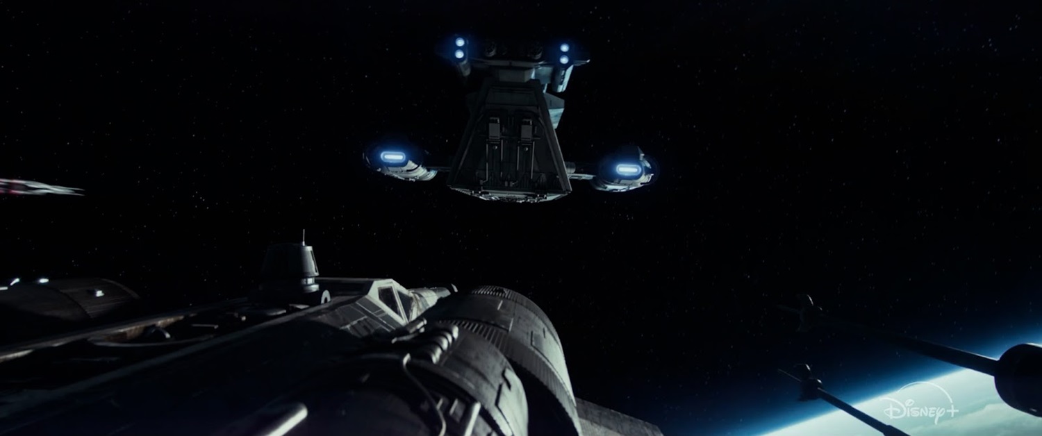 Shot #12B - The camera is “attached" to the TIE as it flies toward an Imperial transport that reminds me of the juggernaut hijacked by Din Djarin and Migs Mayfeld in The Mandalorian season 2 episode “The Believer."