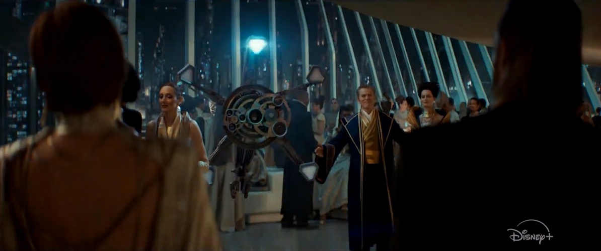 Shot #31: At a party on Coruscant. The camera is behind Mon Mothma and her husband Perrin Fertha (Alastair Mackenzie) as they arrive and are greeted by Davo. A camera droid hovers in front of them and we can see the city-planet’s skyline through the windows. This must be where Mon meets Krennic.