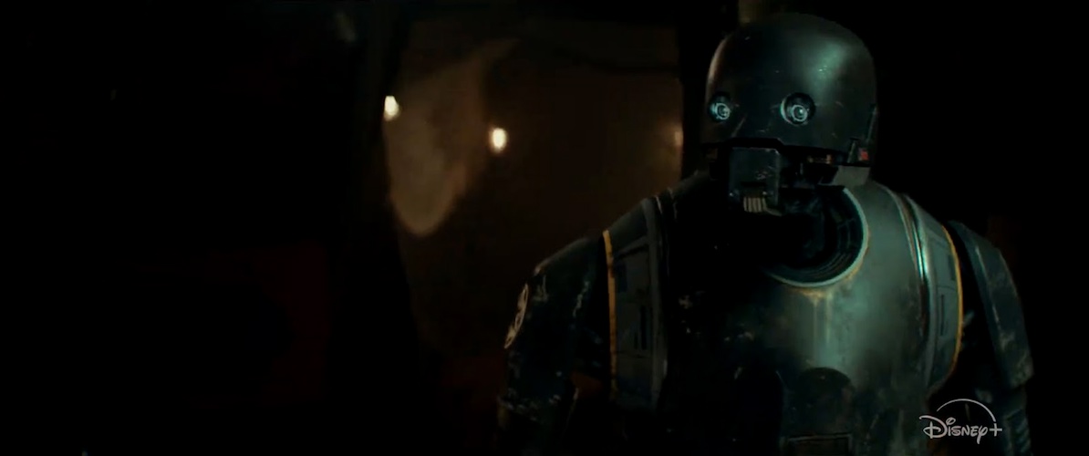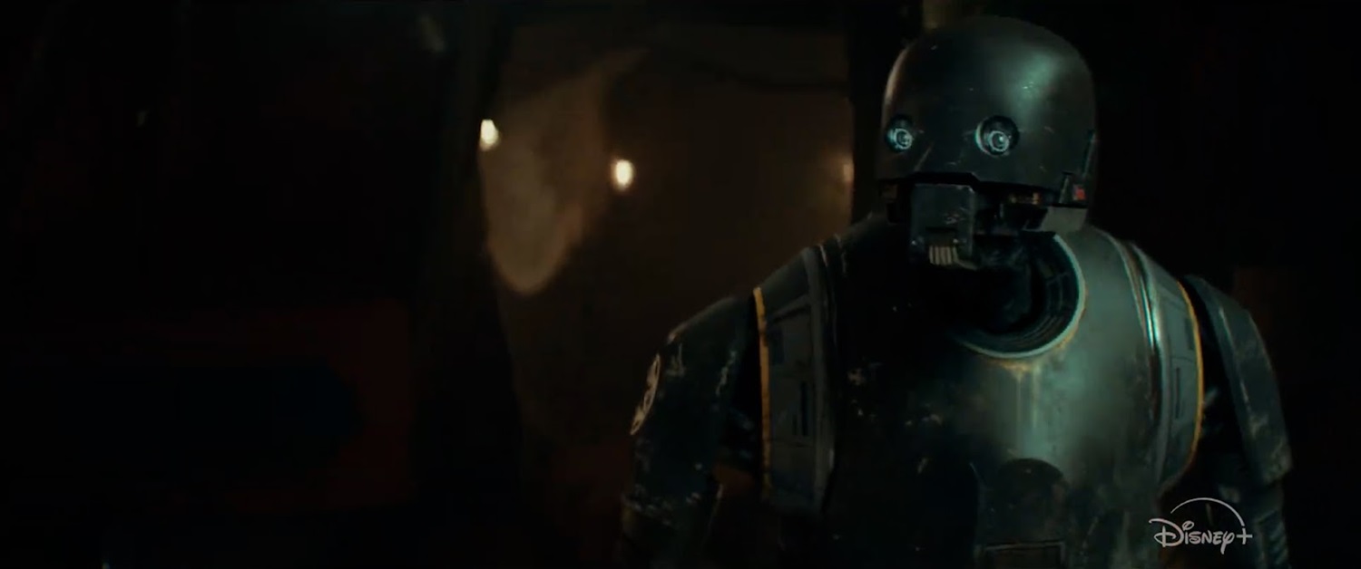 Shot #32: Oh hey, it’s our old pal K-2SO (Alan Tudyk), the reprogrammed Imperial security droid from Rogue One: A Star Wars Story. Here, K lifts up his head in a dimly lit location. The big question is whether K will have the same origin story he was given in the canon Star Wars: Rogue One - Cassian & K-2SO comic book from 2017.