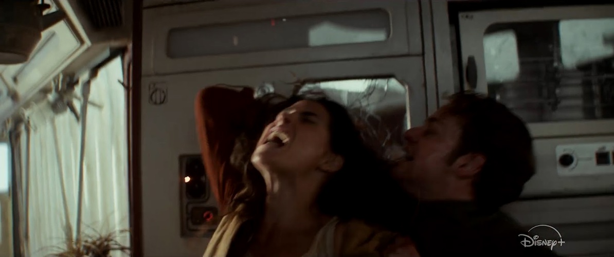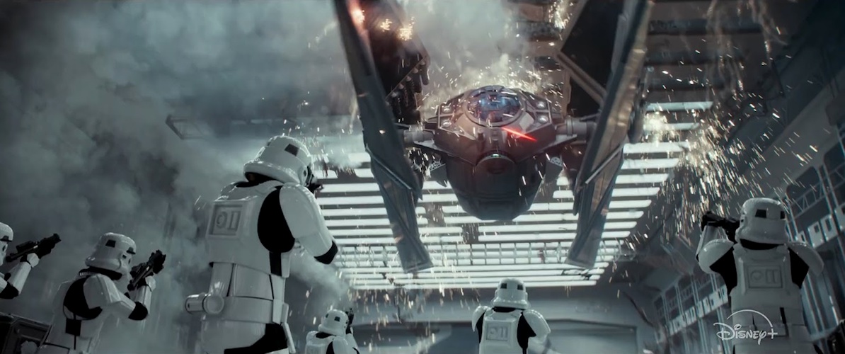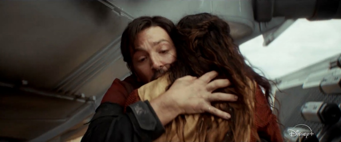Shot #34: Cassian and Bix hug, reunited after the events of the first-season finale. Oh and hey, they’re standing under the chassis of that stolen TIE Avenger.