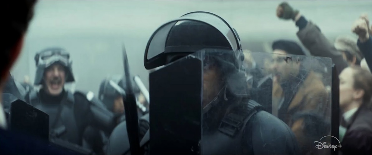 Shot #35: A black-armored Imperial riot control trooper (or someone disguised as one) lowers his visor and readies his shield as an aggressively unruly crowd chants behind him. There’s also someone in a blue top in the foreground and another trooper with a moustache and a goggled helmet behind him.