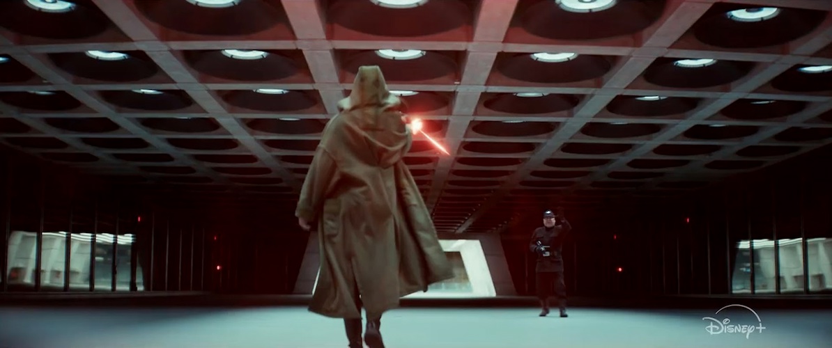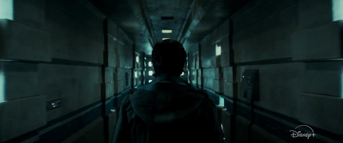 Shot #5 - The pattern repeats. Closer shot, higher angle. Cassian walks through another hallway– this time with a more cramped, brutalist style of architecture– wearing a hooded windbreaker. There’s an electronic control panel on the right-side wall. My guess is this is the Rebel Alliance base on Yavin IV.
