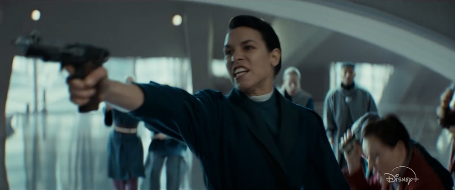 Shot #40: I’m honestly not sure who this is, so I’m not going to even venture a guess. Regardless, she pulls a blaster on a crowd in a sterile environment as people dressed as ordinary citizens duck to get out of the way.