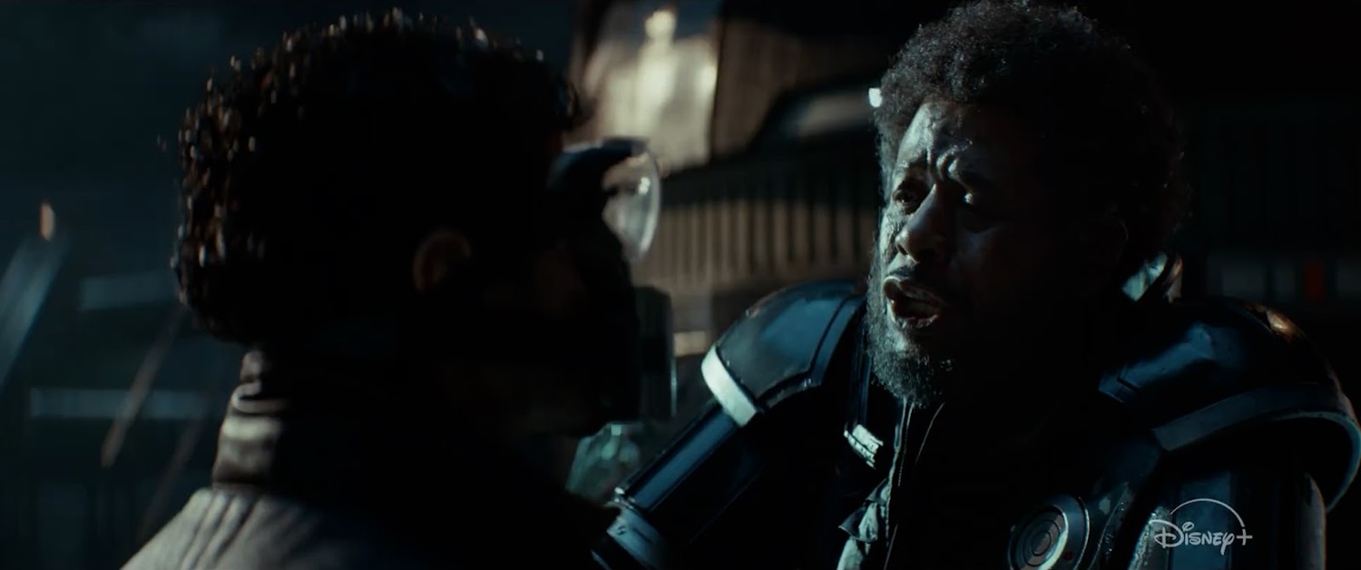 Shot #49: Saw’s the one holding Cassian by the lapels this time, and he shouts a few inspirational lines right into Andor’s gas-masked face.