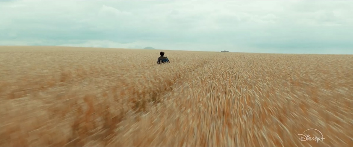 Shot #9 - The camera zooms above a field of grain as Cassian (?) runs toward the mostly empty background. There is a structure and a mountain visible in the distance. The sky is cloudy.