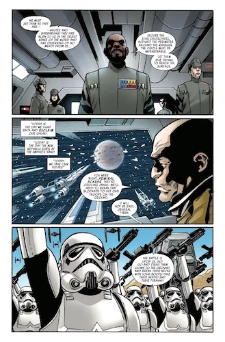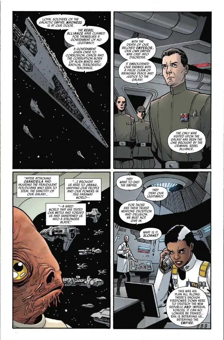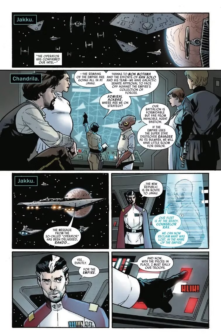 The Battle of Jakku - Last Stand #3 begins with a briefing at the New Republic’s temporary headquarters on Chandrila, where Han Solo, Princess Leia, Agent Bastion, Chancellor Mon Mothma, and Jedi Knight Luke Skywalker meet to discuss strategy. Meanwhile in orbit around Jakku, Counselor Gallius Rax gives a speech to the forces of the Imperial remnant, ostensibly in order to rally the troops, although Admiral Rae Sloane has put the pieces together that Rax has betrayed the Galactic Empire. So here’s where– in the 11th of 12 issues of The Battle of Jakku– the titular Battle of Jakku actually begins. There are some well-drawn action scenes courtesy of artist Leonard Kirk, as the New Republic’s fleet is initially overwhelmed by Imperial ships– victims to a trap sprung by Rax as triple-crosser. But there are several wild cards at play here that will tip the scales in a variety of directions.