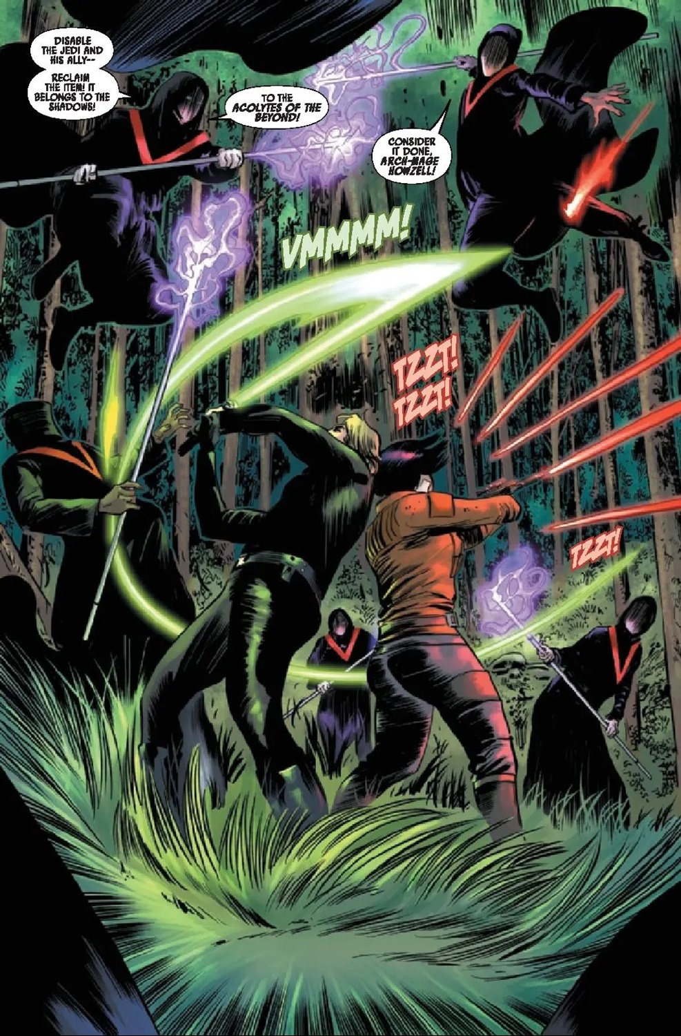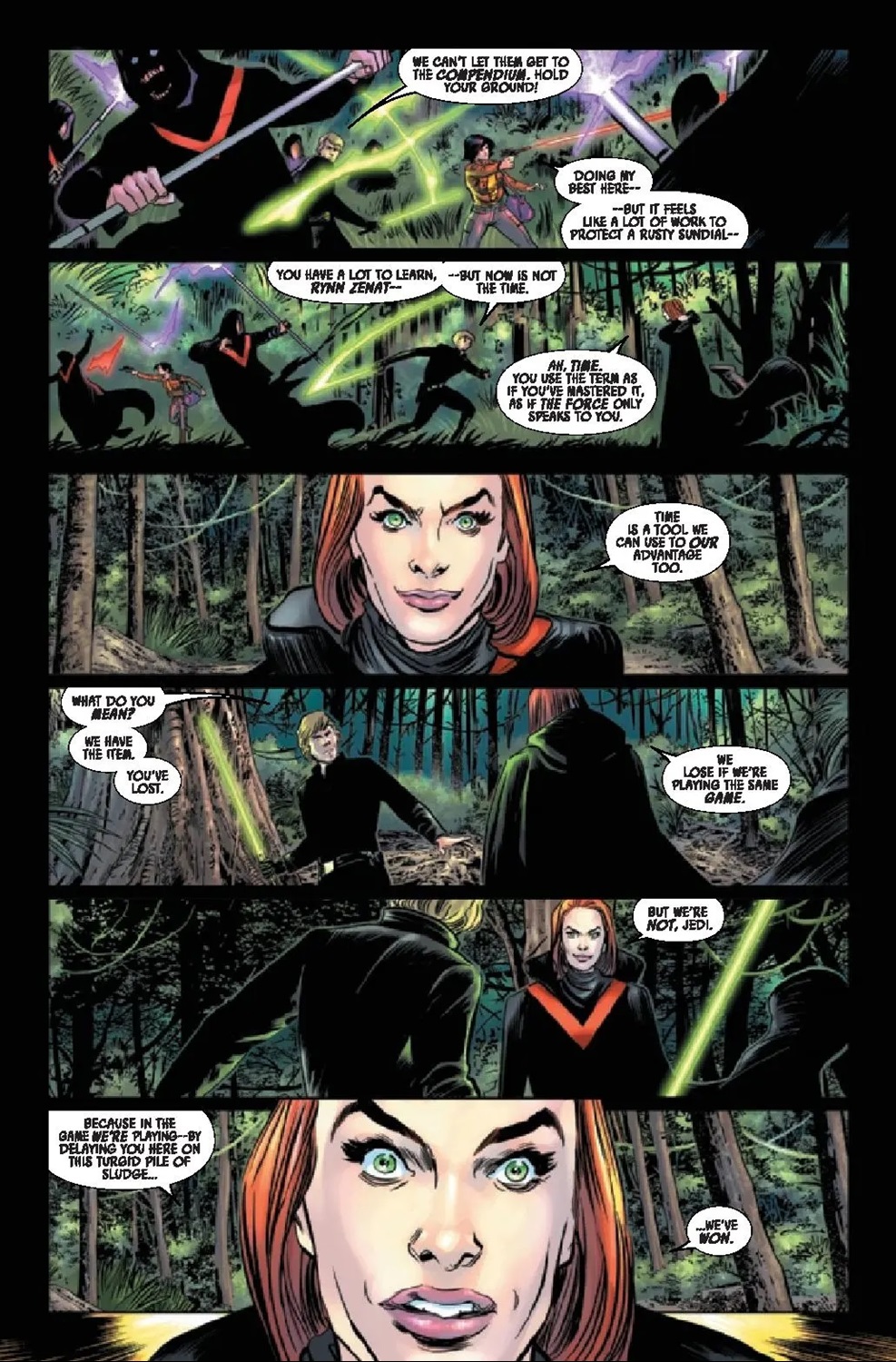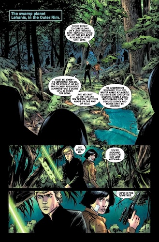 The Battle of Jakku - Republic Under Siege #1 begins on the swamp planet of Lehanis (newly introduced here), where Jedi Knight Luke Skywalker and New Republic pilot Rynn Zenat (who first popped up in The Battle of Jakku - Insurgency Rising) are hunting for a Jedi artifact that they do not want to fall into the hands of the dark-side cult known as the Acolytes of the Beyond. Speaking of which, our two heroes are attacked by the Acolytes in an attempt to reclaim the Compendium that once belonged to a Jedi Master named Ky Narec– best known to Star Wars: The Clone Wars fans as Asajj Ventress’s first master before she turned to the dark side of the Force. Meanwhile on Chandrila, Senator Leia Organa Solo ponders the future of the Republic, as she receives a distress call from a Wookiee leader on Kashyyyk searching for Chewbacca and Leia’s husband Han. Here’s where The Battle of Jakku starts to overlap with the events of the second and third books in Chuck Wendig’s Star Wars: Aftermath novel trilogy, as we also hear about the Akiva Summit from the newly promoted Grand Moff Adelhard in the Anoat sector.