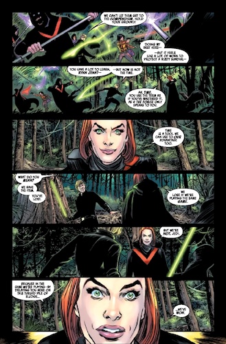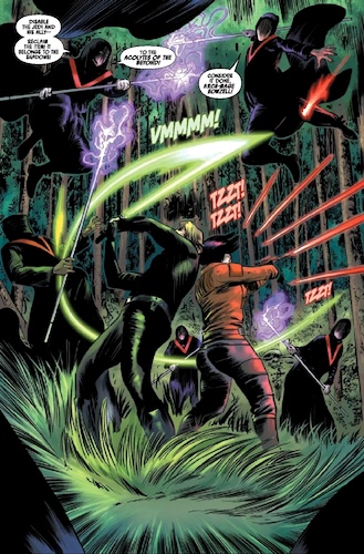Adelhard is seeking to consolidate his power and bring together the remaining forces of the Galactic Empire, but there are several other high-ranking Imperial officers out there who would do the same, including Grand Admiral Sloane, who served as the chief antagonist in Aftermath. Unfortunately for Adelhard, there’s also a traitor working in his midst, who we as the readers know to be Lieutenant Alaytia, though he hasn’t quite determined that yet. But the Acolyte of the Beyond called Reyna Oskure has an inkling, and resultingly Adelhard sends Purge Trooper commander Bragh to investigate. In orbit around the planet Malastare, another officer called General Loring has entrenched himself, eliminating any rebel forces that attempt to bring him down. After Loring is approached by Adelhard to join forces, he must weed out a spy in his own crew who sends this information to the Republic. Back on Lehanis, Luke and Rynn succeed in escaping from the Acolytes with the artifact, but it’s stolen once again at the last minute by our old pal Chelli Lona Aphra, who appears in a cliffhanger splash page saying how she really should trail Skywalker more often.