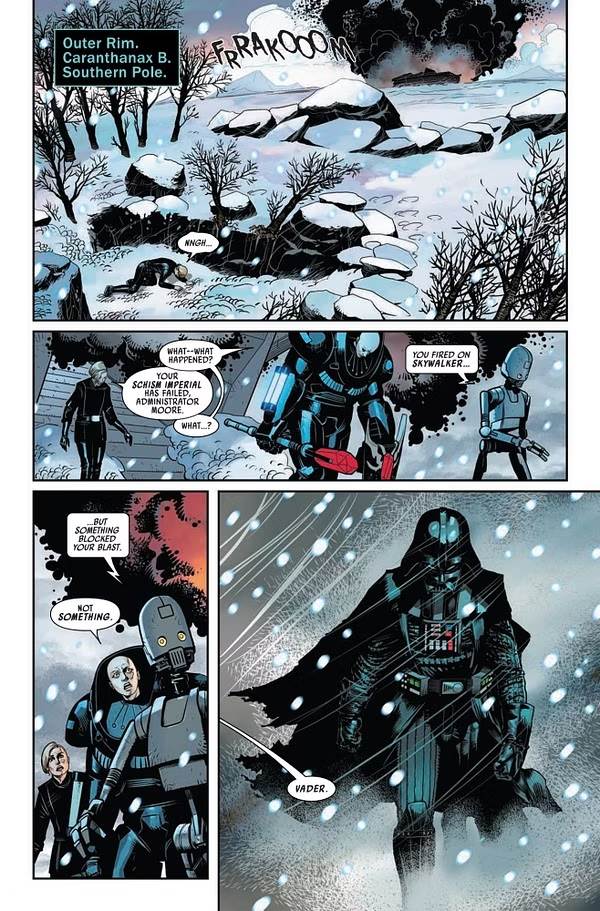 Star Wars: Darth Vader (2020) #50 is divided into four individual (and all equally compelling) parts, each of which is written by Greg Pak and illustrated by a different artist– namely Raffaele Ienco, Paul Fry, Luke Ross, and Adam Gorham. The first chapter, entitled “Destroyer," serves as the conclusion to the main storyline we’ve been following for the past 50 issues, culminating in a grand battle between the titular Dark Lord of the Sith and Emperor Palpatine himself. But first Vader must reclaim his Kyber-fueled weapons from Administrator Sly Moore, whose “Schism Imperial" has been striving to depose Palpatine and take the reins of the Empire. Meanwhile, Luke Skywalker escapes Carathanax B. with the help of the M.A.R. Corps, Sabé the former Naboo handmaiden, and the Force-sensitive thief from Jedha, Warba Calip.