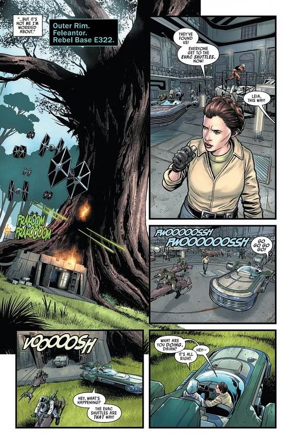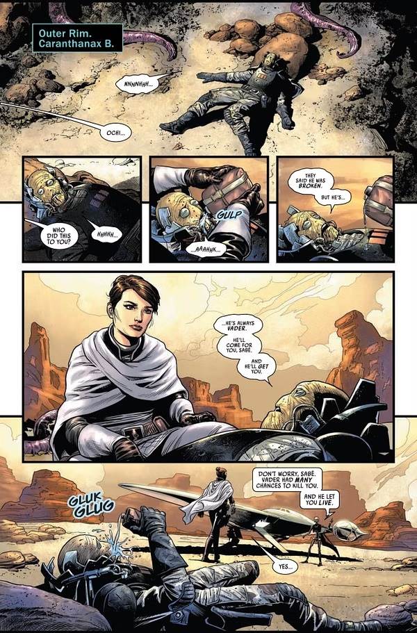 In chapter 3, Sabé finds Ochi’s battered (but still living, as he must survive to kill Rey’s parents later on in the timeline) body and then sets off to briefly kidnap Princess Leia and test the rebel leader to make sure she wouldn’t join Vader’s side if given the opportunity. And lastly, Pak follows up on the story of Kitster and Wald– the two slaves from Tatooine who we first met in Star Wars: Episode I - The Phantom Menace– as they return to their home planet and sell some of the energy rods they stole before escape the final battle we saw in the first chapter. They use this money to free the other slaves they were friends with as children– namely Amee, Melee, and Seek, though now that they’re reunited they all start to wonder whatever became of their pal Anakin who left decades earlier to become a Jedi.
