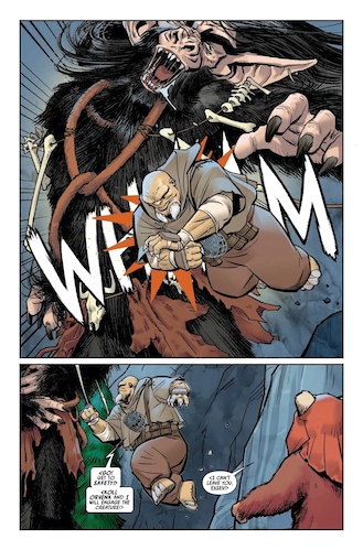Ewoks #4 begins with the invading Imperial mercenary party having awoken the Gorax from its cave– this creature first appeared in Lucasfilm’s 1984 made-for-TV movie Caravan of Courage: An Ewok Adventure, but has since been brought over into the current canon. The mercenaries fight back, while Meedro and Asha launch their own sneak attack against the interlopers. In the ensuing chaos, General Koyatta and Khu Fornot sneak into the cave to retrieve armaments from the Imperial stash hidden inside. Now an AT-ST (piloted by Koyatta) and a speeder bike (driven by Fornot) enter the fray, though Asha manages to knock the latter from his perch fairly quickly. The Dowutin Orvenk tries his best to fell the Gorax without killing it, but Koyatta shows no such hesitation, executing the beast with an EPS-6 superheavy blaster cannon shot through the heart.