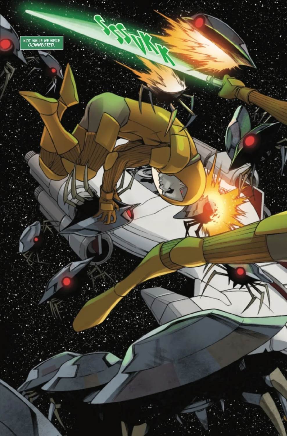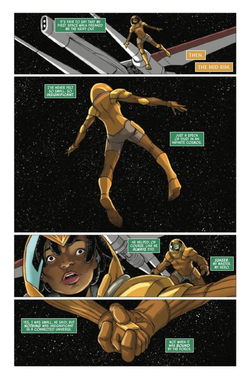 At the end of the previous issue, Jedi Knight Keeve Trennis had retaken the Jedi flagship Ataraxia along with re-capturing the ex-Nihil Tempest Runner Lourna Dee. And together with the Force-bond Jedi twins Ceret and Terec, they have ventured across the Stormwall into the Nihil-occupied occlusion zone in search of missing-in-action Trandoshan Jedi Master Sskeer. As, The High Republic (2023) #4 opens, we get a flashback to Keeve’s Padawan training under Sskeer and how he helped her through her very first spacewalk. Then writer Cavan Scott cuts back to the present, where Trennis is spacewalking once again, though this time her intention is to fight off the scav droids that have arrived to dismantle the Ataraxia. Meanwhile Terec and Ceret work to hack into Lourna Dee’s protocol droid Q4 and retrieve a code that will send the scav droids scattering.