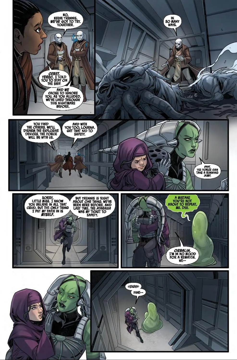 Boolan uses this new perception of Sskeer– who says he’s “not so sure" if he even considers himself a Jedi anymore– to whisper in the Trandoshan’s ear about how he could “help him rise again," while Dee is persuaded by Jedi Master Torbalin to return into the station to help. Here we cut to Terec and Ceret, who are attempting to disable one of Lourna’s bombs when they are interrupted by Boolan’s Igor-like assistant Reek and two Nameless– one of which is still alive and active despite now being headless. The bomb explodes, affecting everyone aboard the station in different ways. One hero and one villain– Terec and Rrkak, specifically– apparently die in the chaos, and Sskeer flees with Boolan aboard the mad scientist’s own personal stormcruiser. On the Ataraxia, Torbalin repairs and revives Lourna Dee’s protocol droid Q4, but they’re also using the ship’s tractor beam to hold the station together so they can’t head off Boolan’s cruiser. Instead, Lourna takes it upon herself to do so in one of the Jedi Vectors.