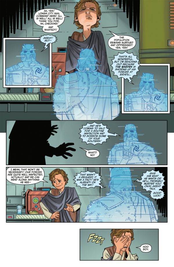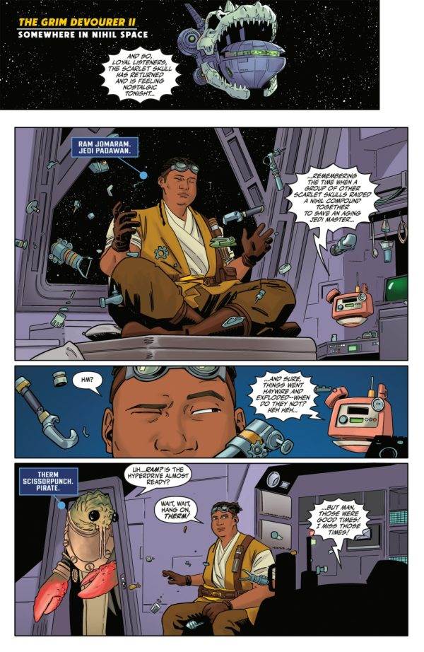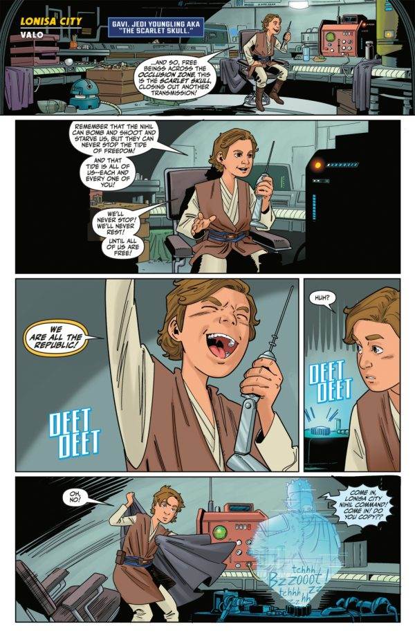 Writer Daniel José Older gets to follow up on his middle-grade novel Star Wars: The High Republic - Escape from Valo in comic form via The High Republic Adventures #11, which begins with the young Padawan Gavi sending out a transmission as the Scarlet Skull (a pseudonym he adopted from his friend and fellow Jedi Ram Jamaram) on the planet Valo. It seems that in the wake of the events of Escape from Valo, Gavi and his compatriots have had to keep up the illusion that the Nihil are still in oppressive control of the planet, but that becomes a problem when he receives a holo-transmission from a Nihil operative informing him that the Warden will be arriving soon for an inspection and to accrue more troops for the upcoming battle against the Jedi on Eriadu. Here’s where Gavi sends out another of his own transmissions, this time heavily suggesting in semi-coded language that he needs Ram’s help once again.